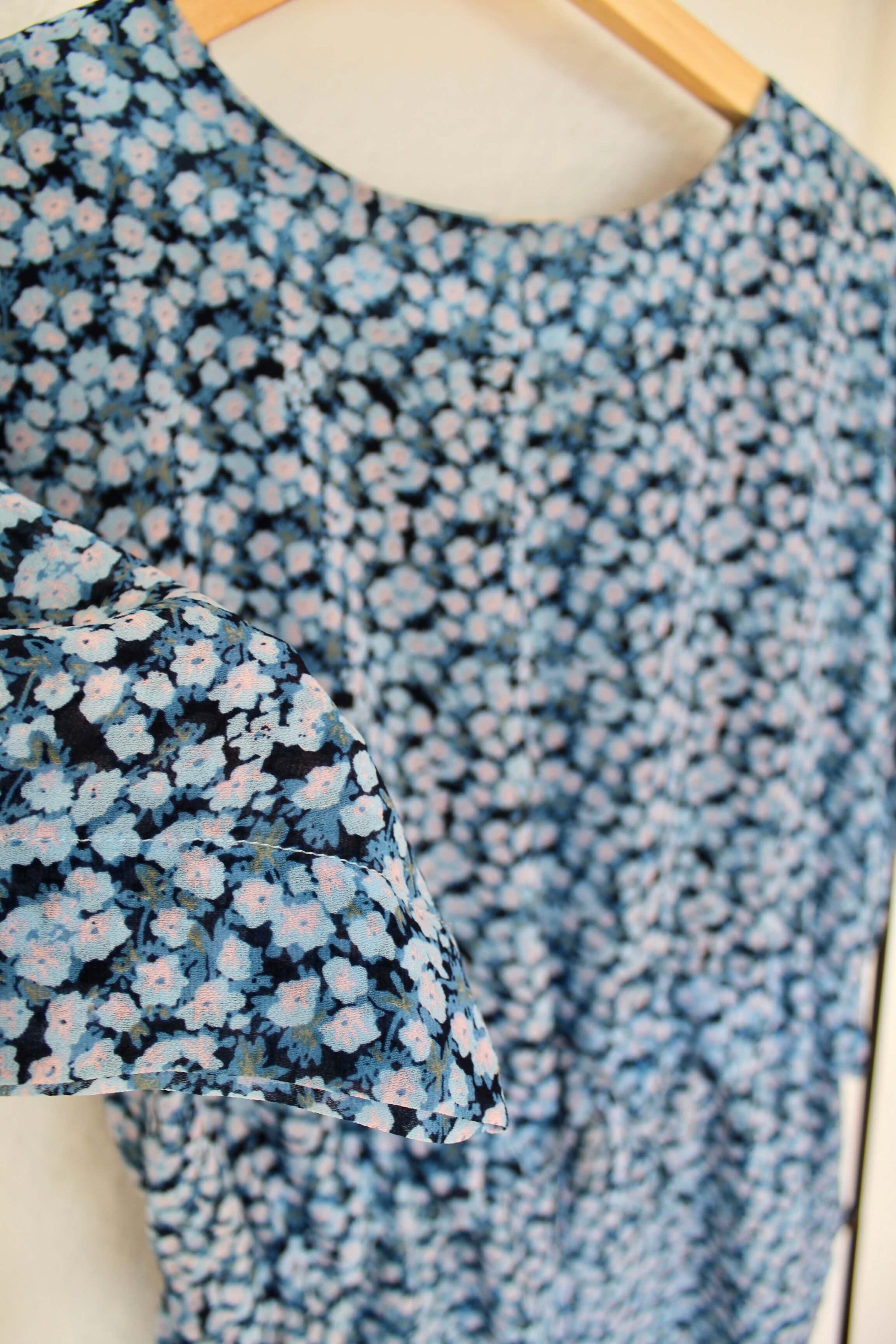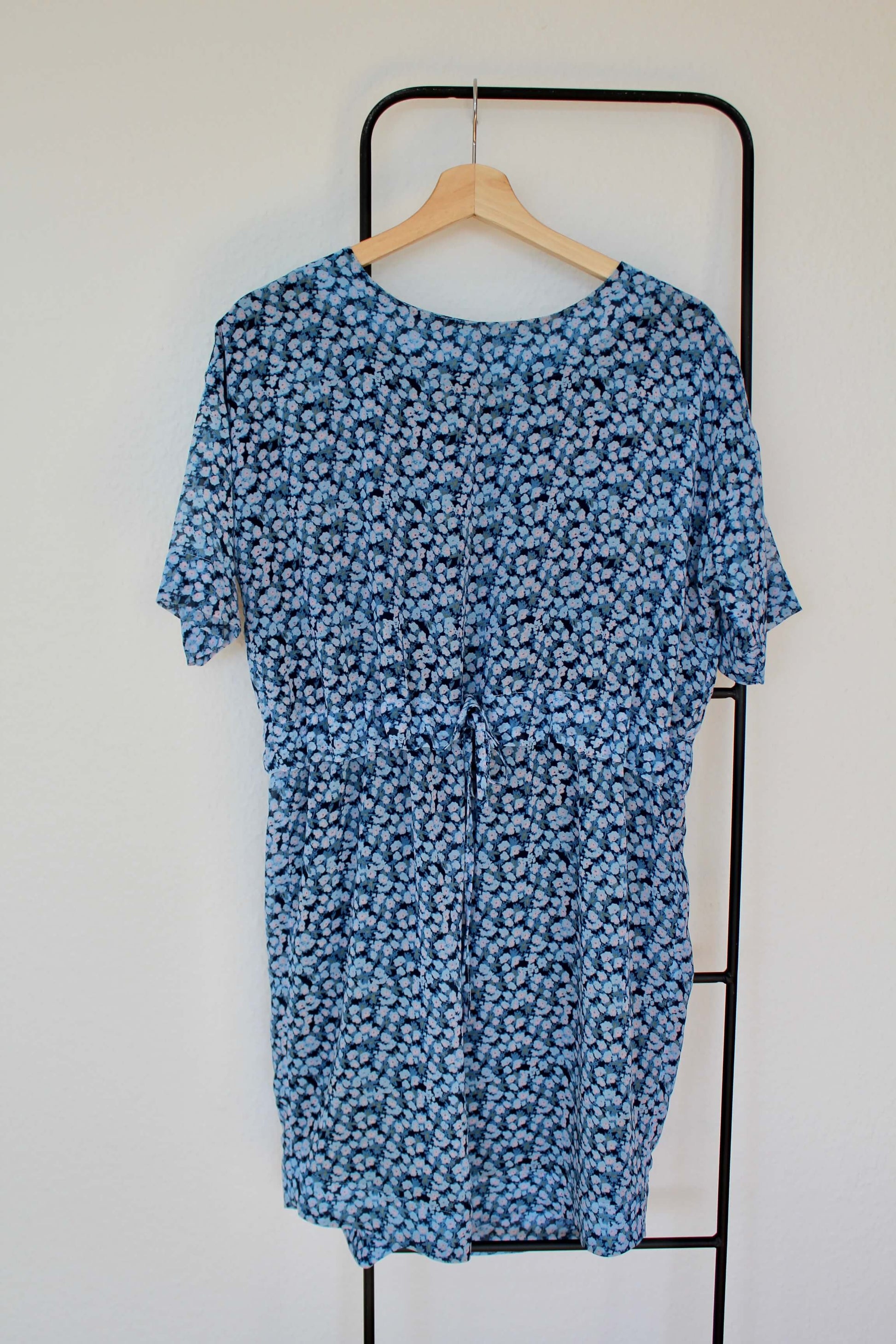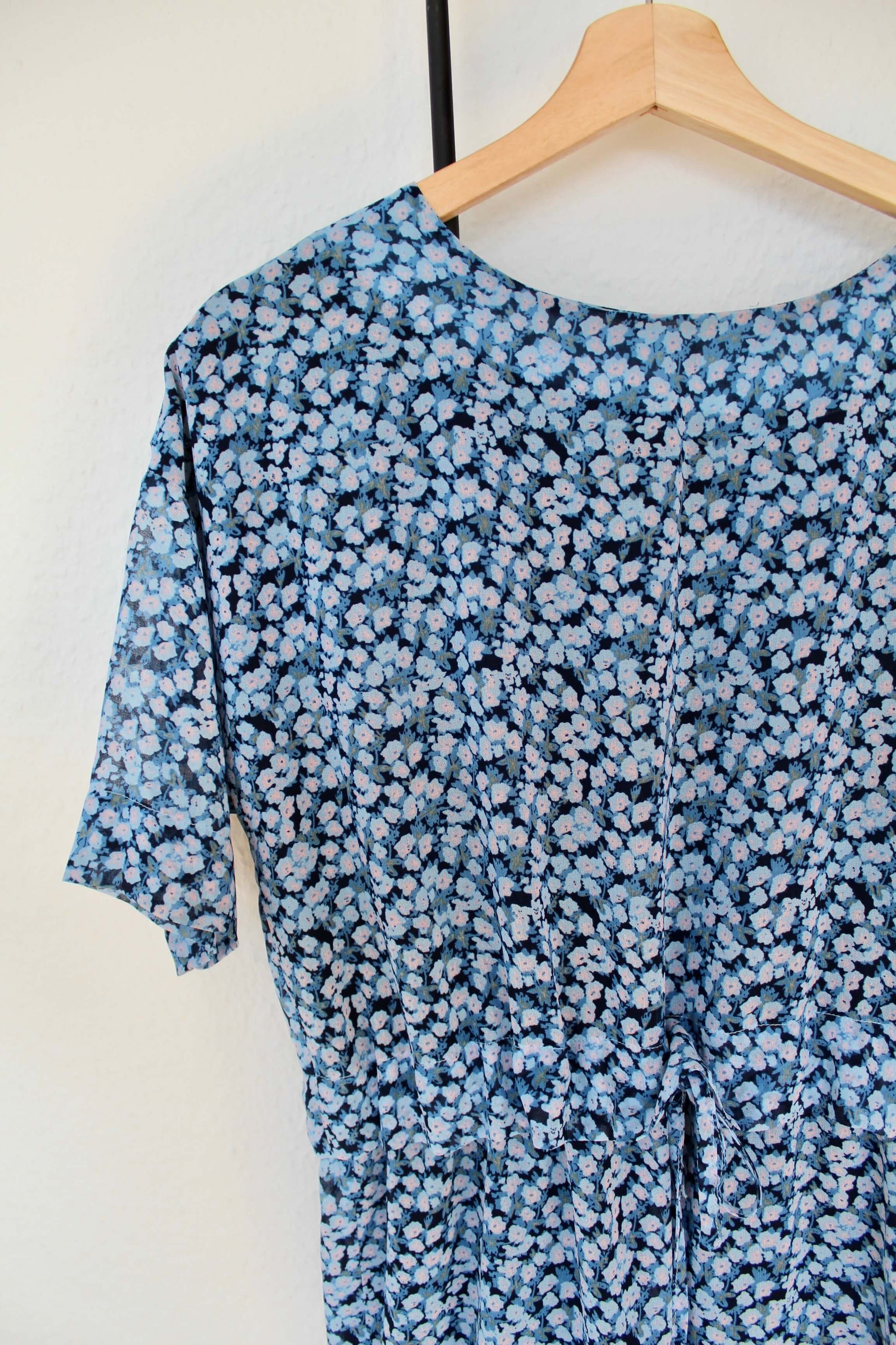 Fineste kjole fra Modström i størrelse S. Kjolen er blå med et blomstret mønster. Den har rund hals samt bindebånd omkring livet, som danner en lille flæse hele vejen rundt når den bindes ♡