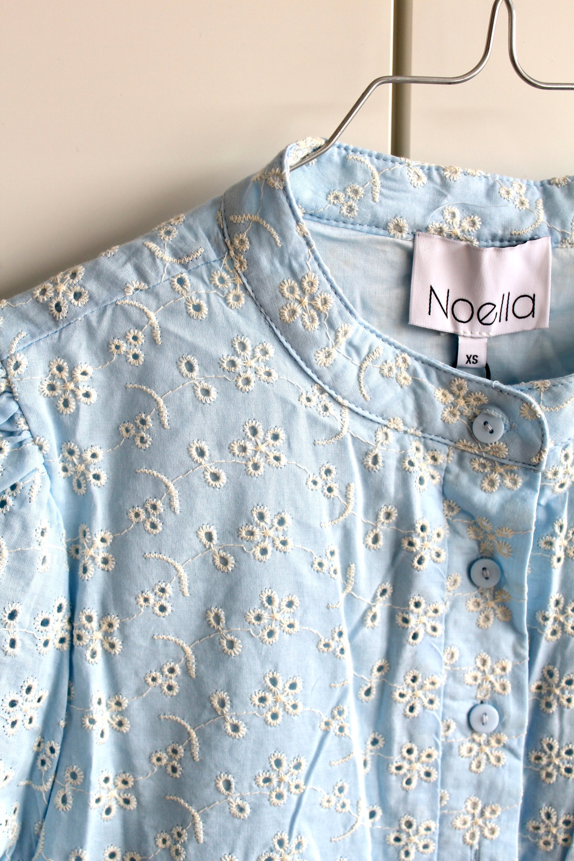 Smukkeste broderie kjole fra Noella i størrelse XS. Kjolen er lyseblå med hvide broderi blomster. Den lukkes med knapper foran. Bindebånd medfølger ikke ♡