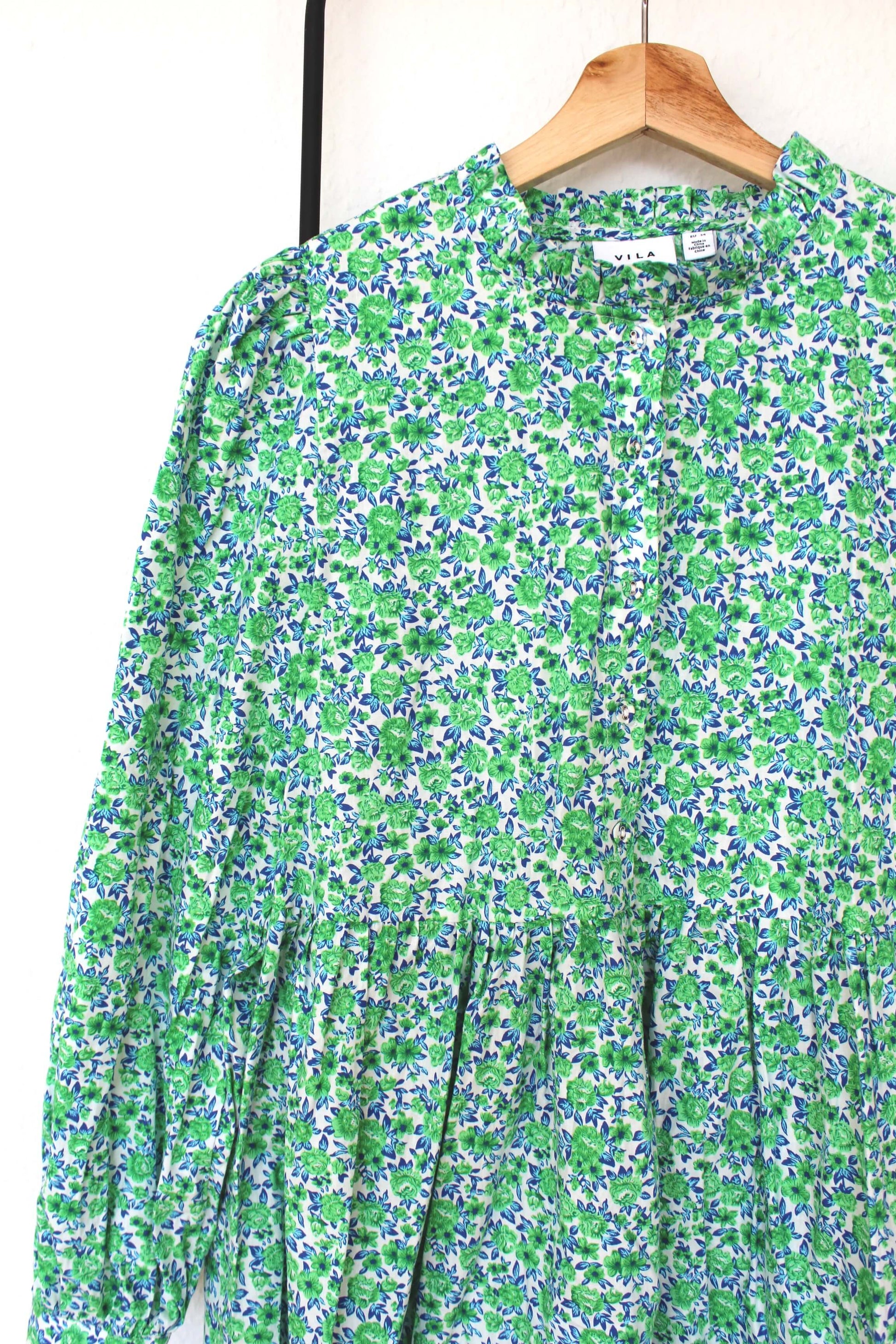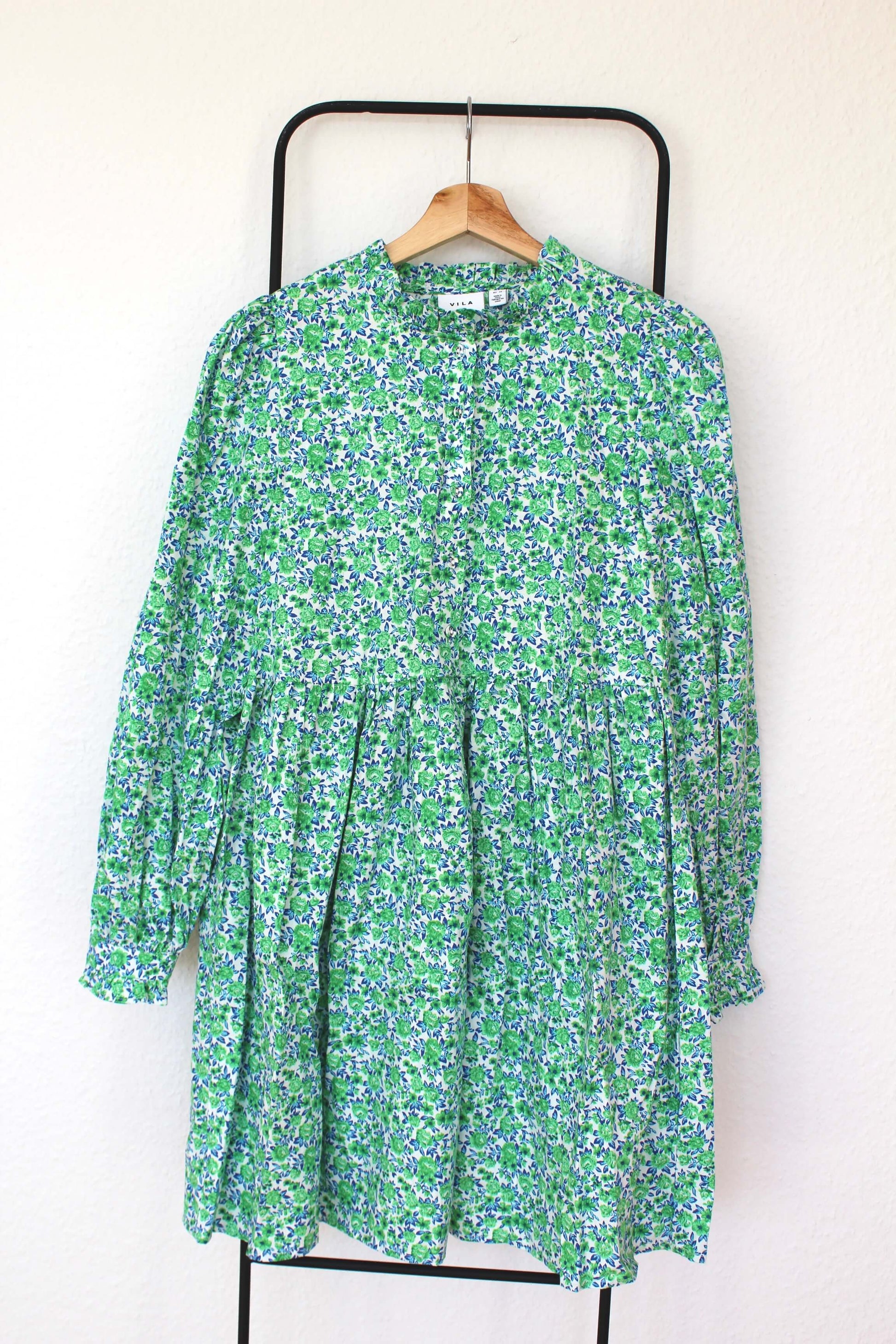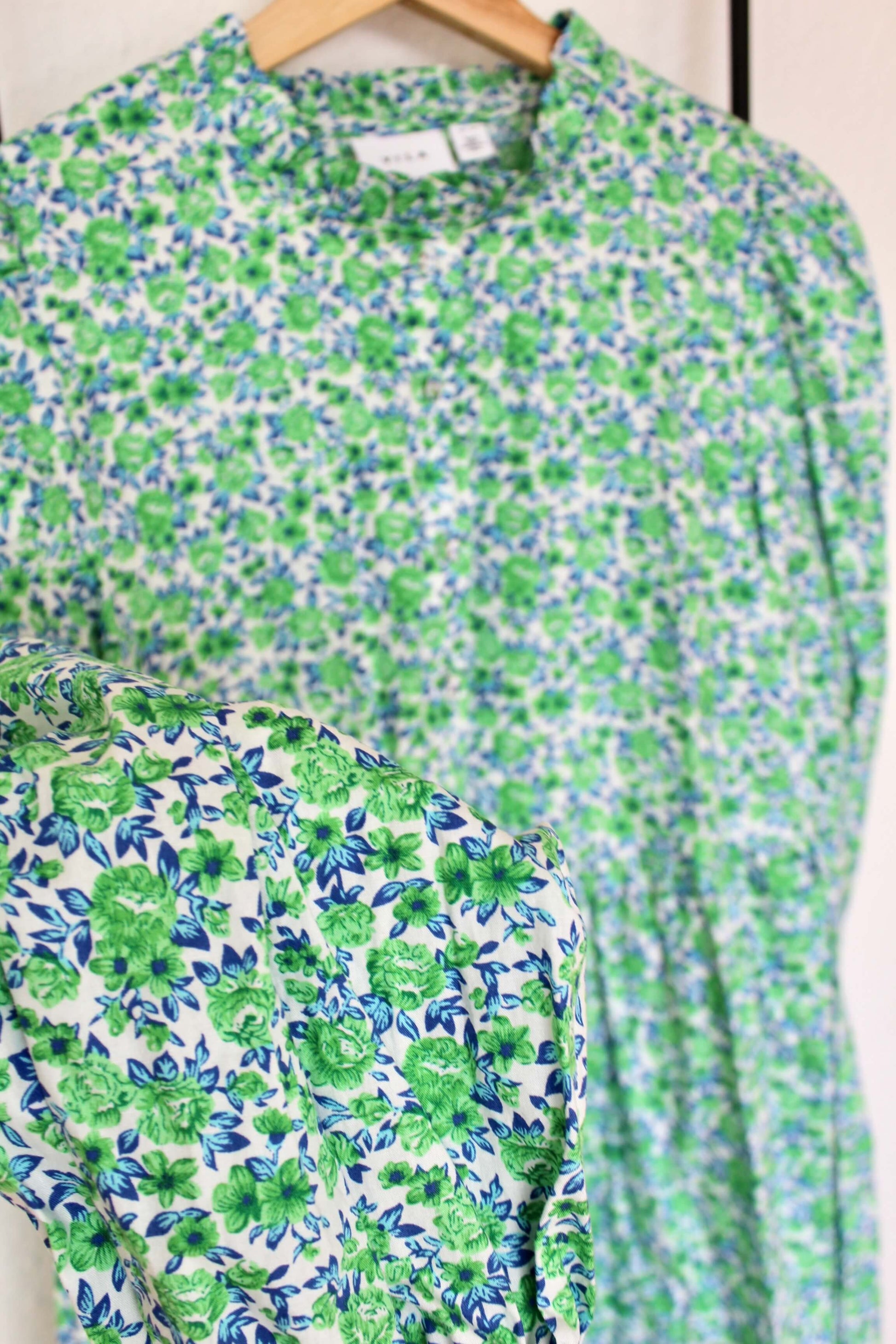 Smukkeste kjole fra Vila i størrelse 34 - vurderes til også at passe en 36. Kjolen har et blomstret mønster i grønne og blå nuancer. Den har flæsekrave, pufærmer og knappelukning foran ♡