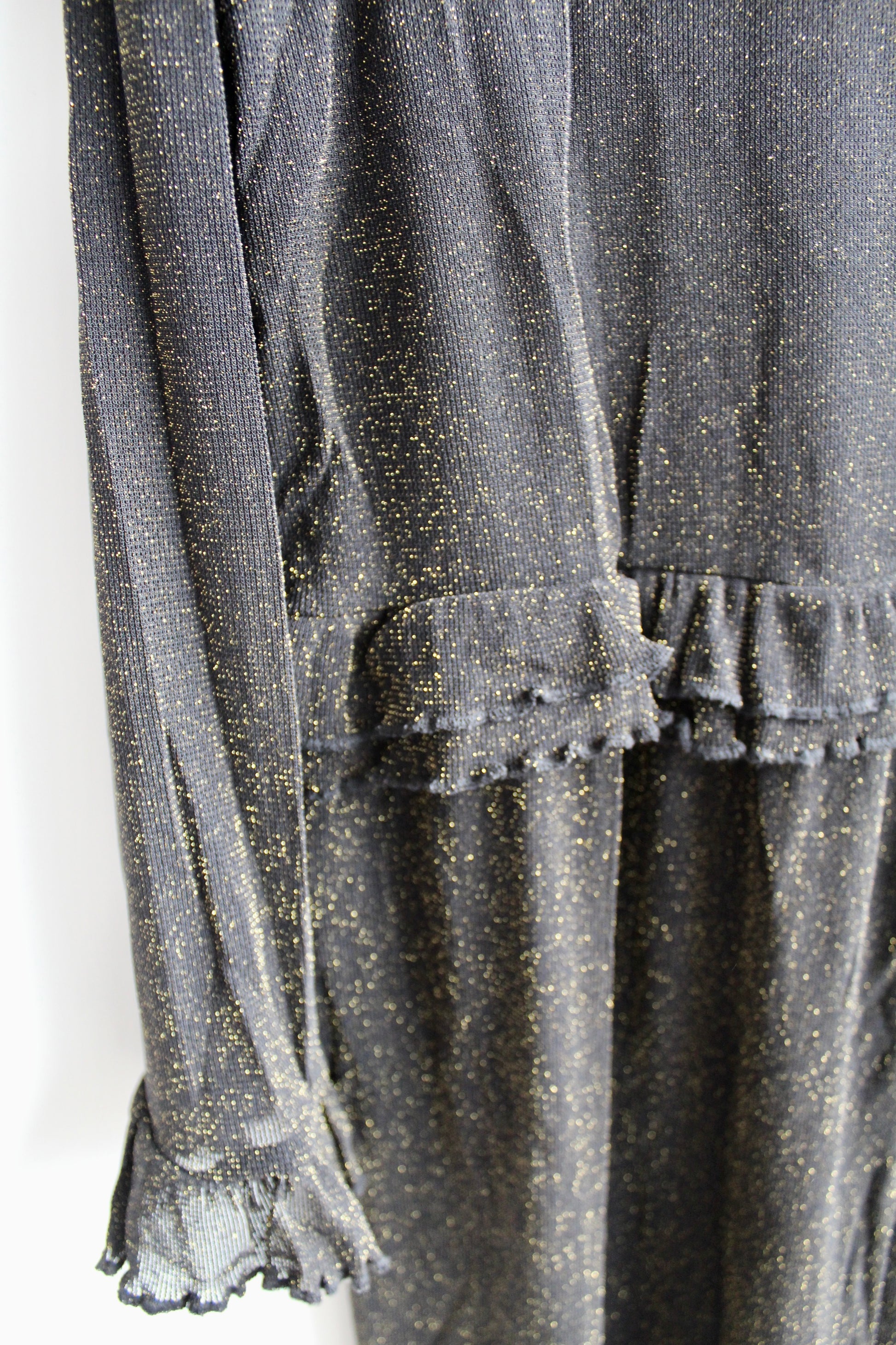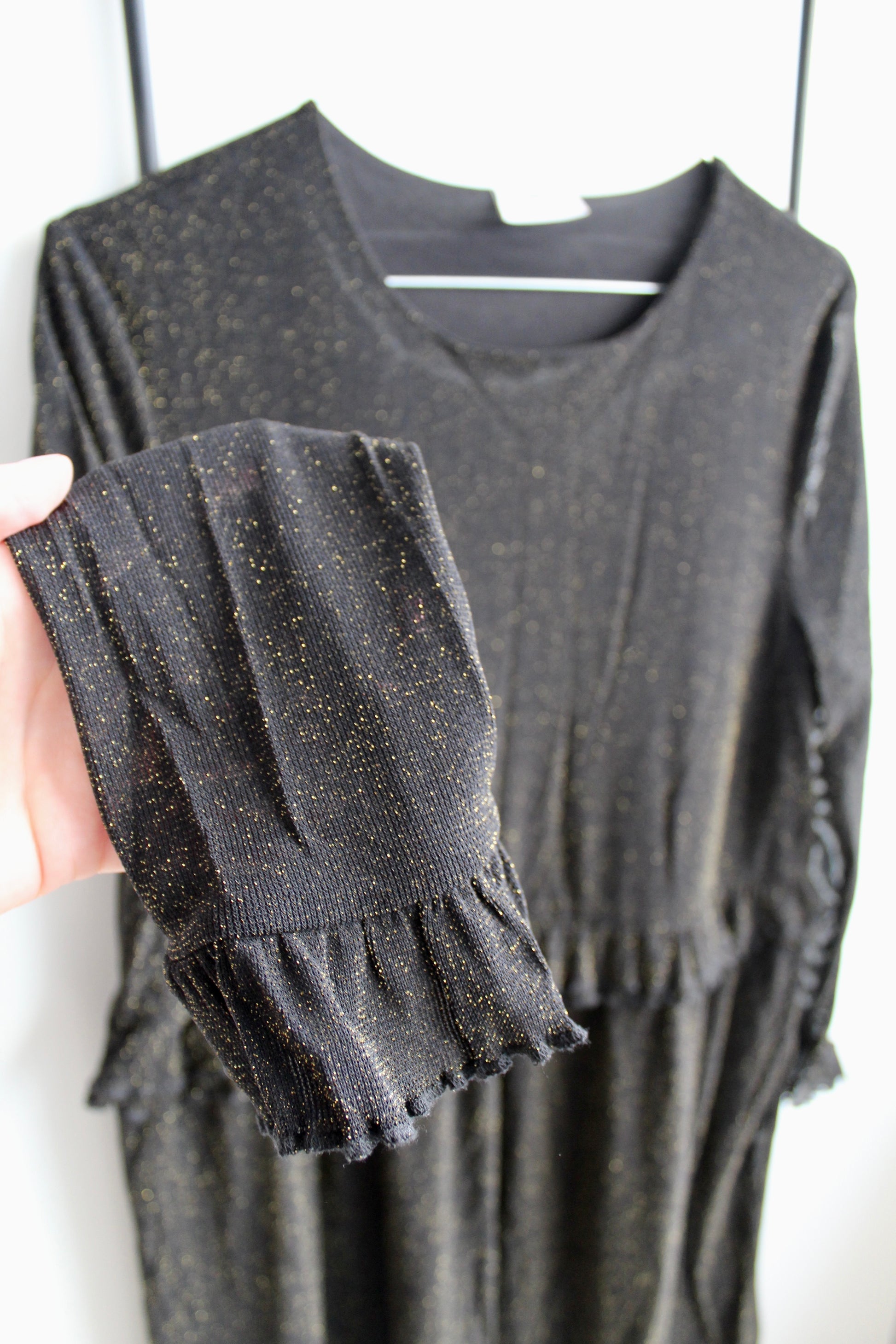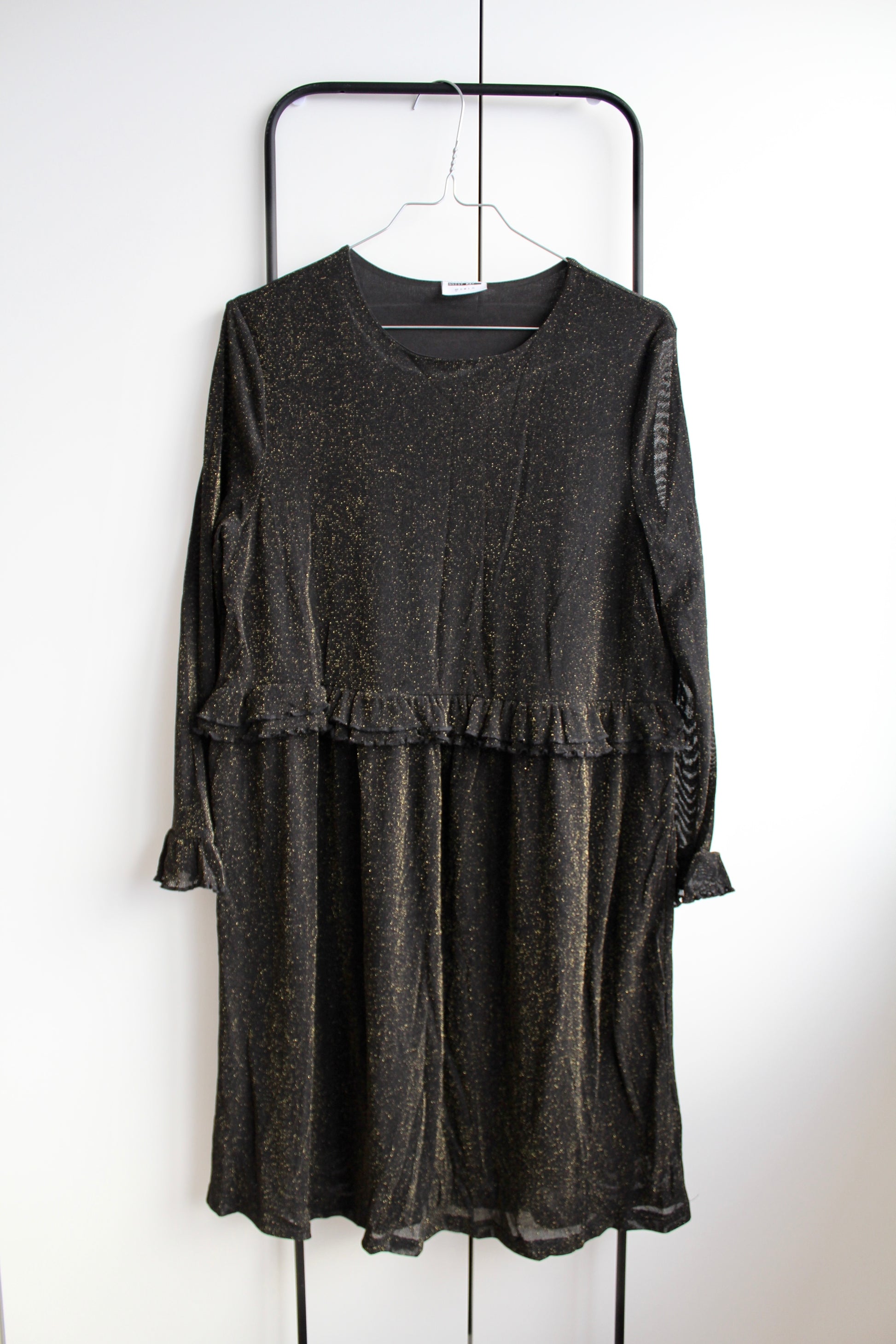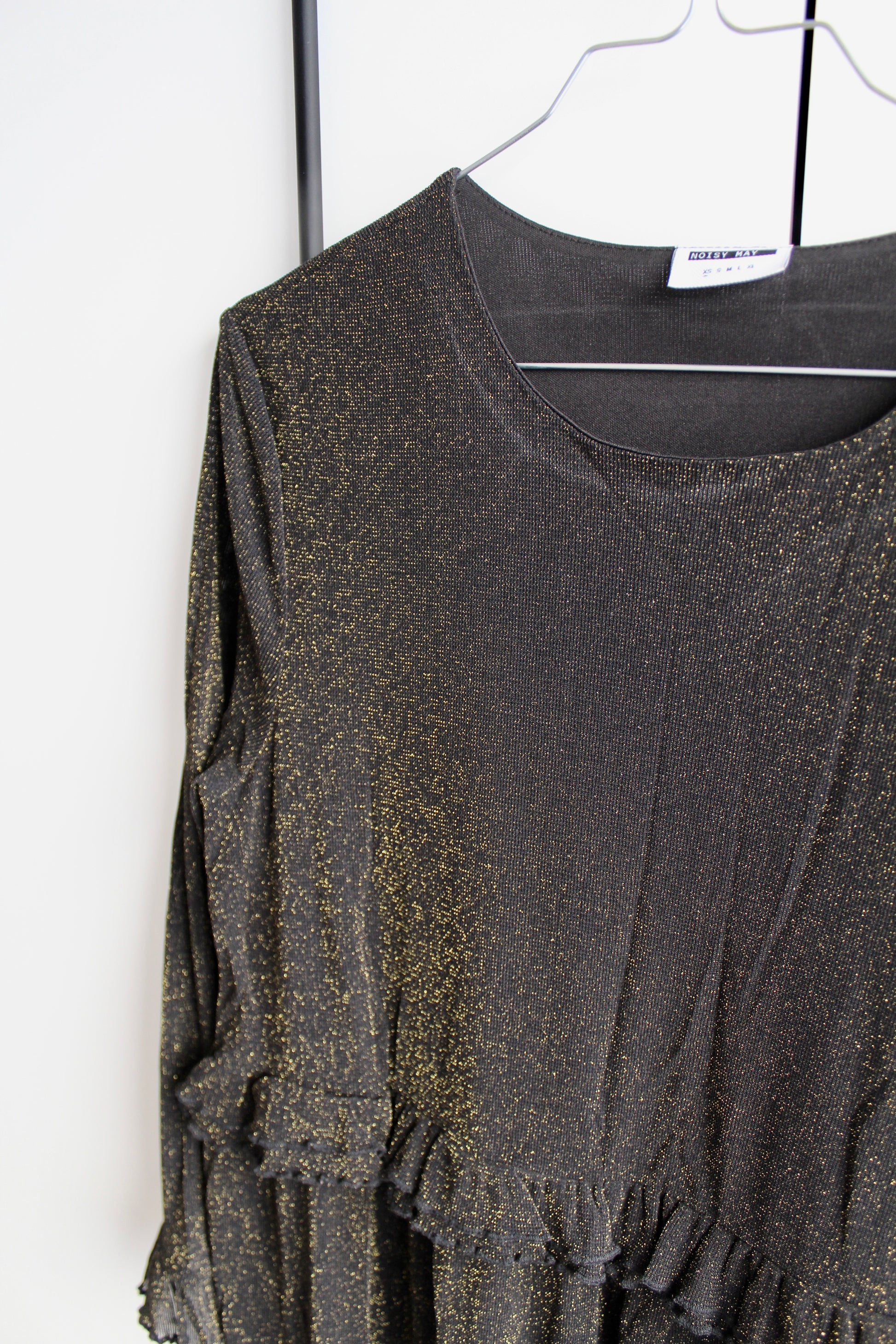 Smuk glimmerkjole fra Noisy May i størrelse XS - vurderes til også at passe en S. Kjolen er sort med guld glimmer. Den har fine frill detaljer flere steder ♡