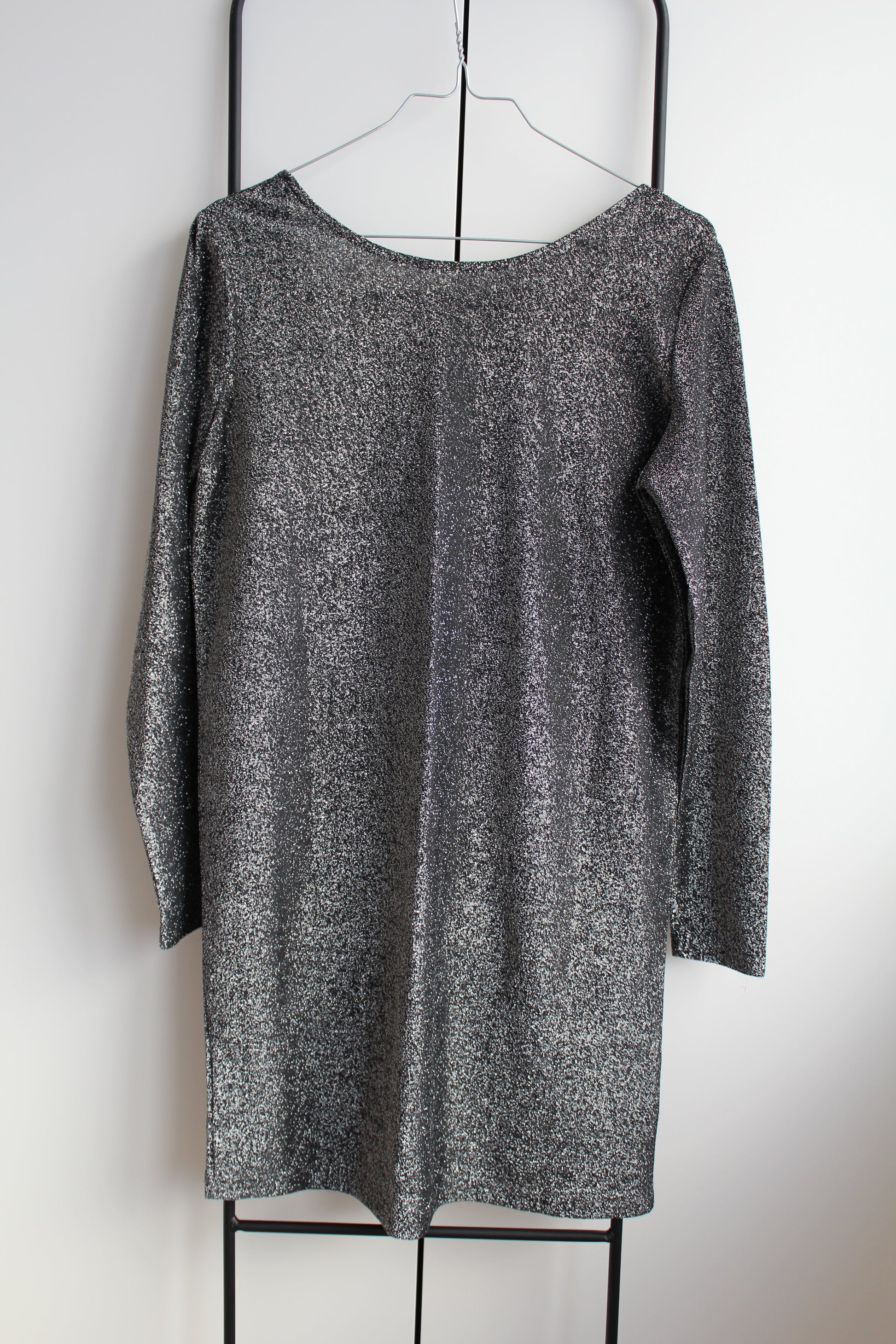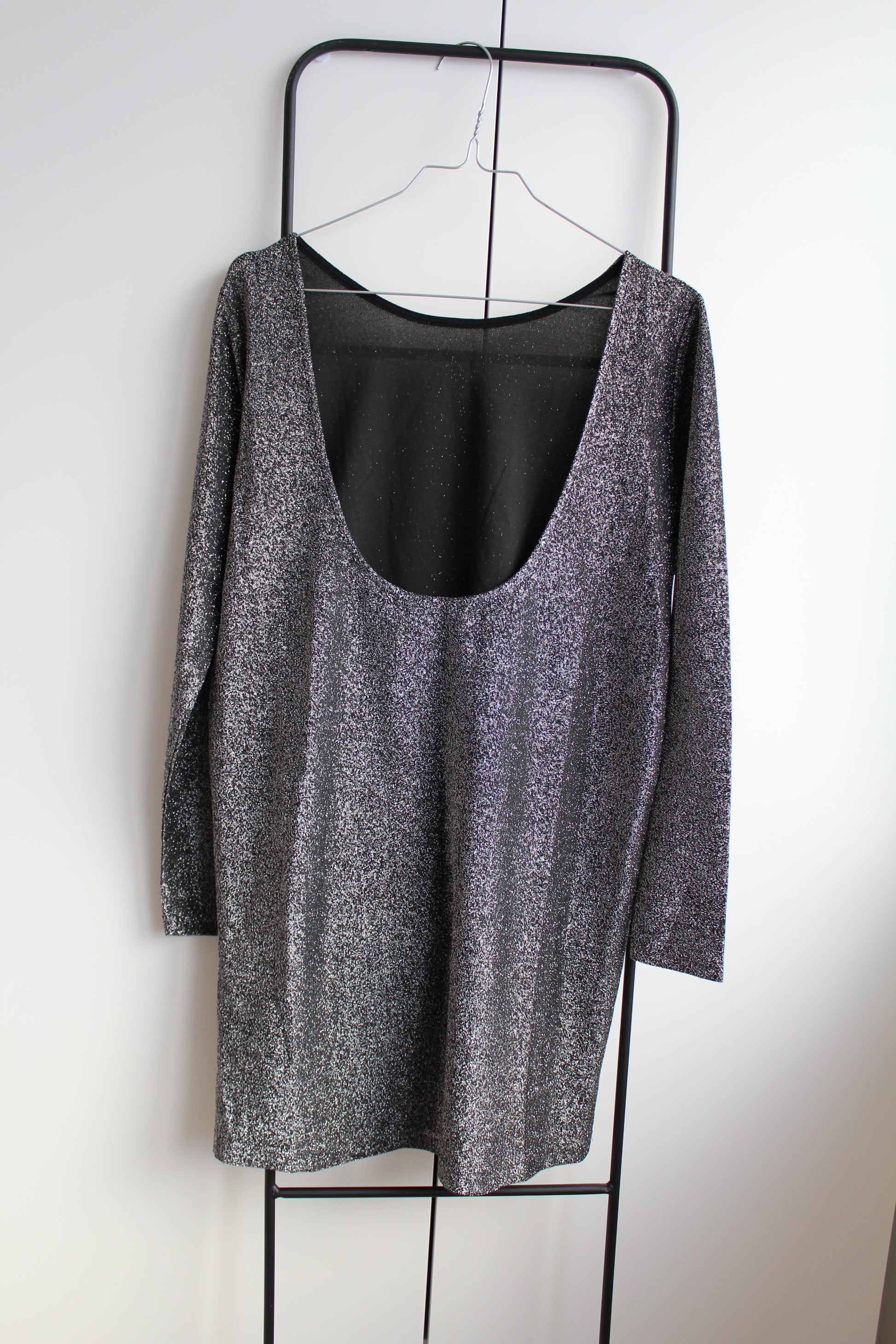 Den smukkeste glimmerkjole med dyb ryg og løstsiddende pasform. Kjolen er mørk med sølv glimmer og ikke andre farver (som det kan ligne lidt pga. lyset på billeder). Perfekt nytårskjole eller julekjole ♡