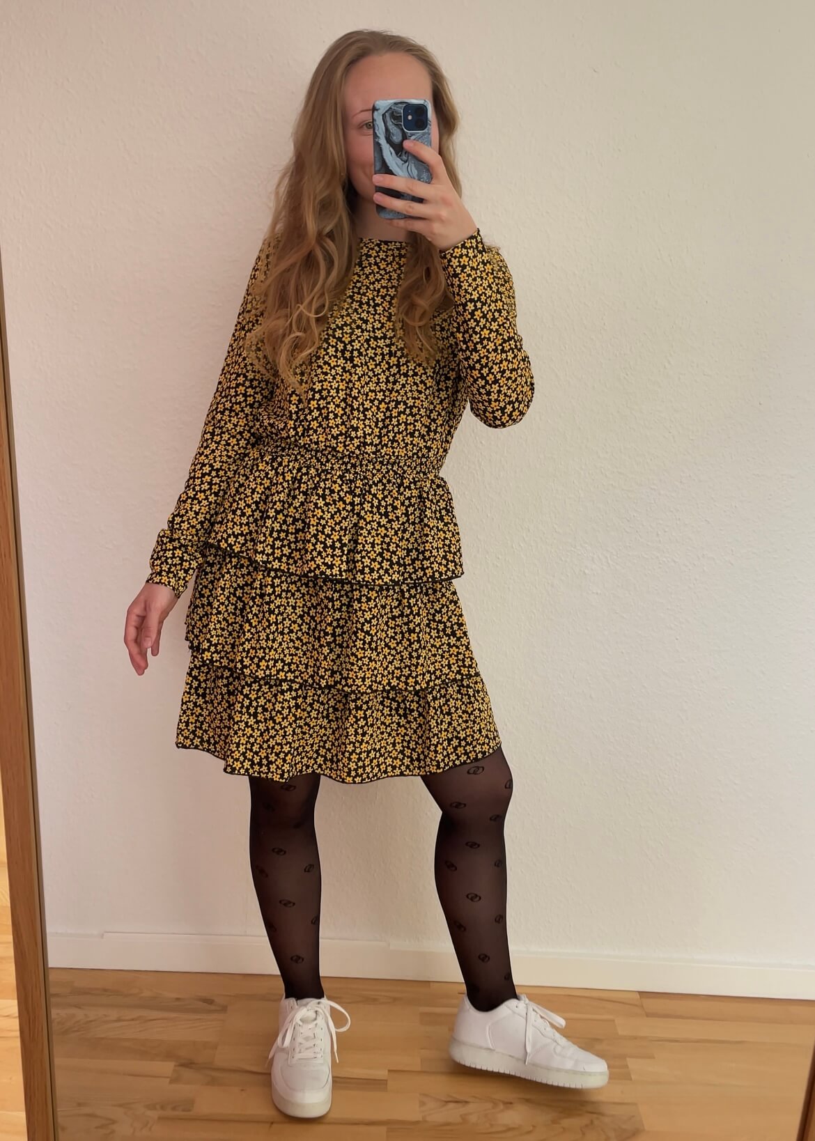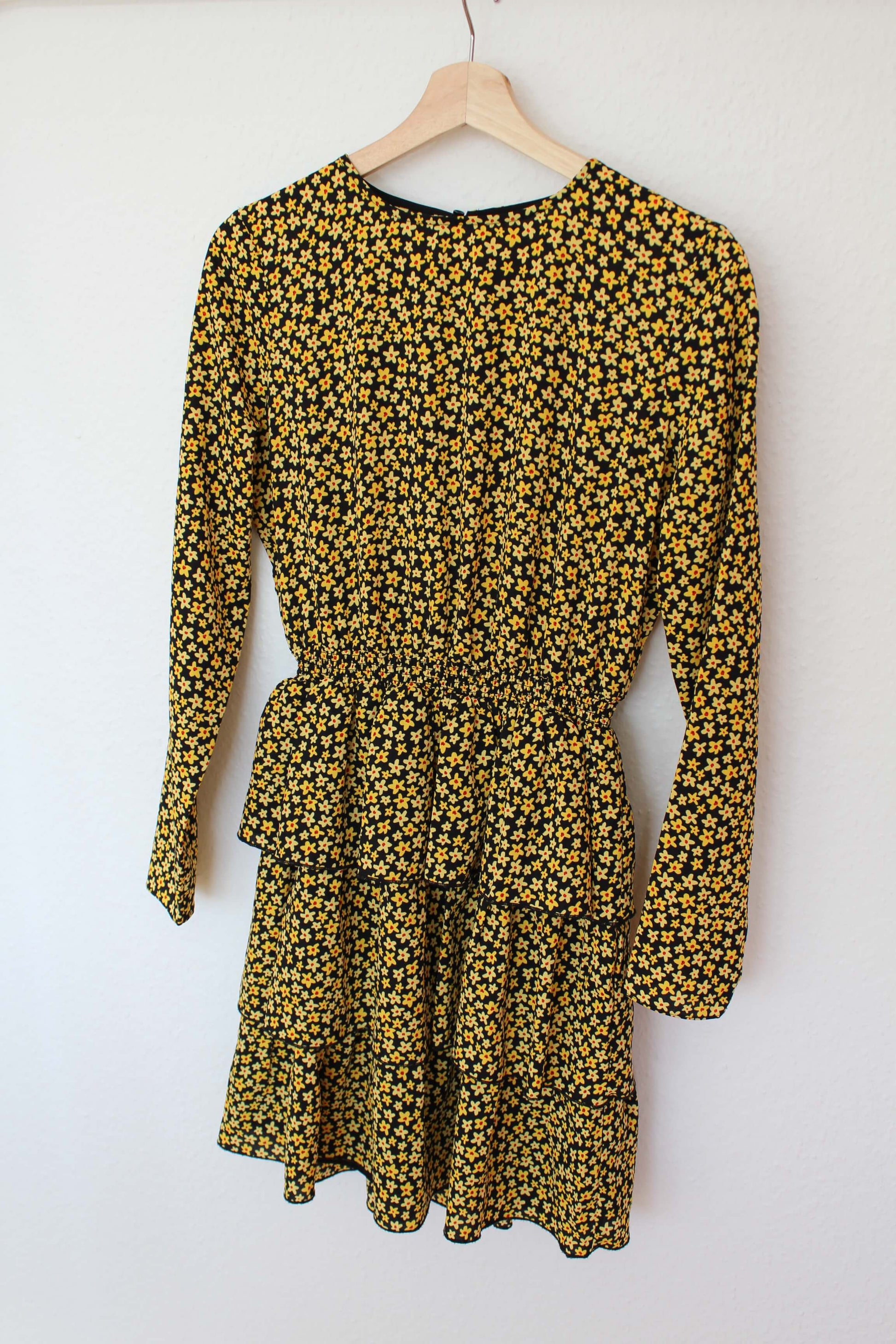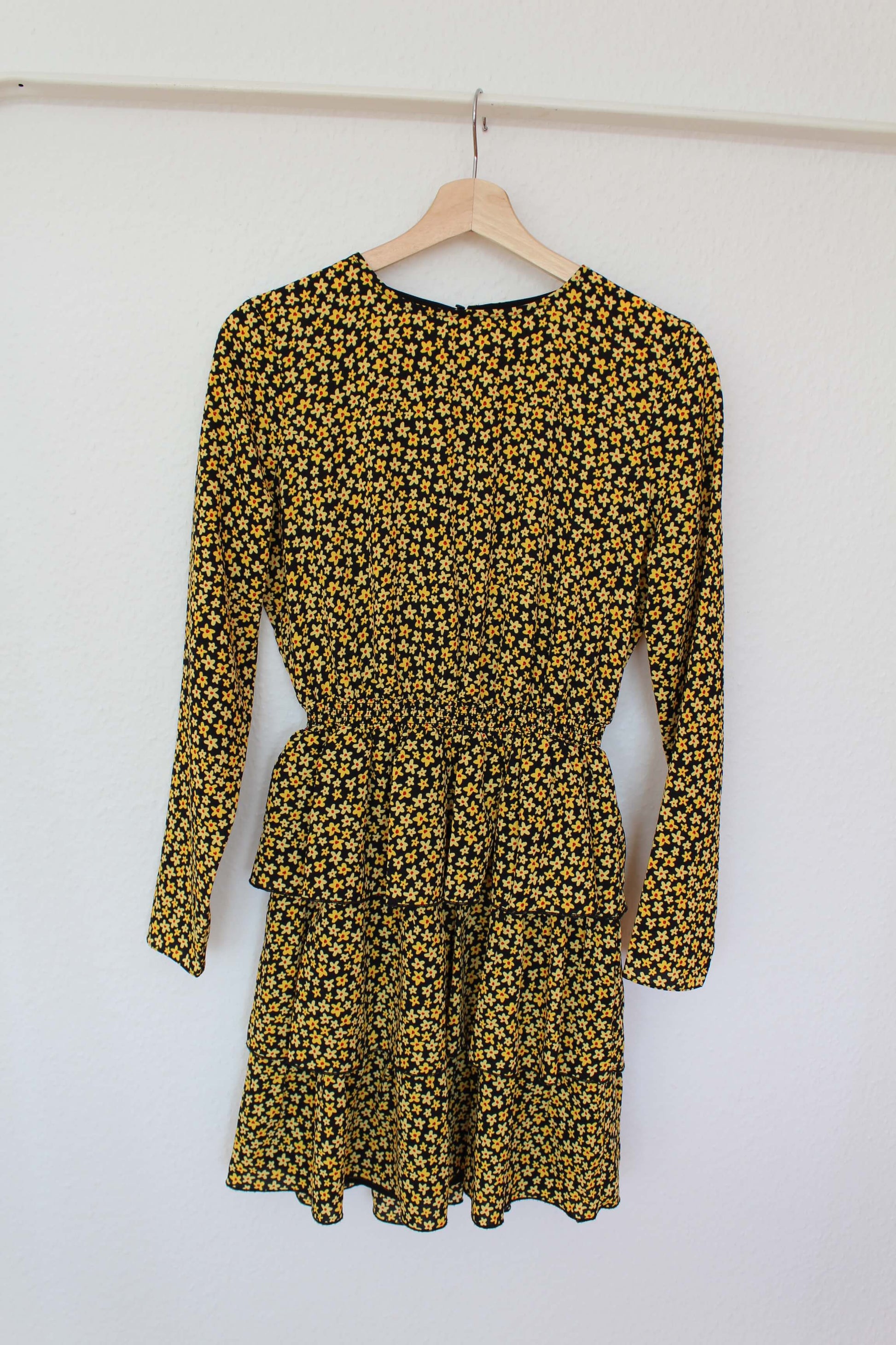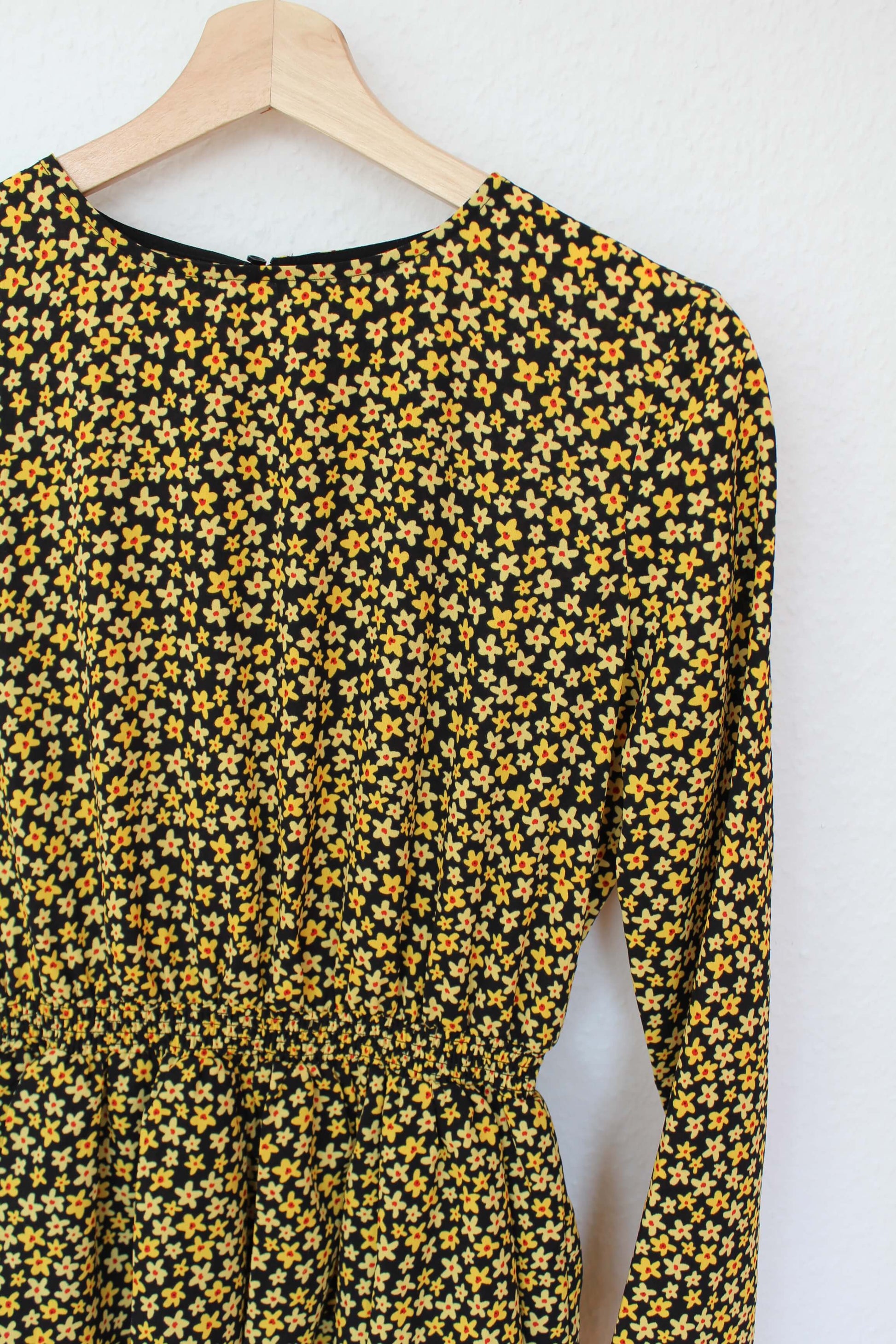 Smukkeste kjole fra Envii i størrelse XS - vurderes til også at passe en S. Kjolen er sort med gule blomster. Den har elastik i taljen og lukkes med en lille knap i nakken ♡