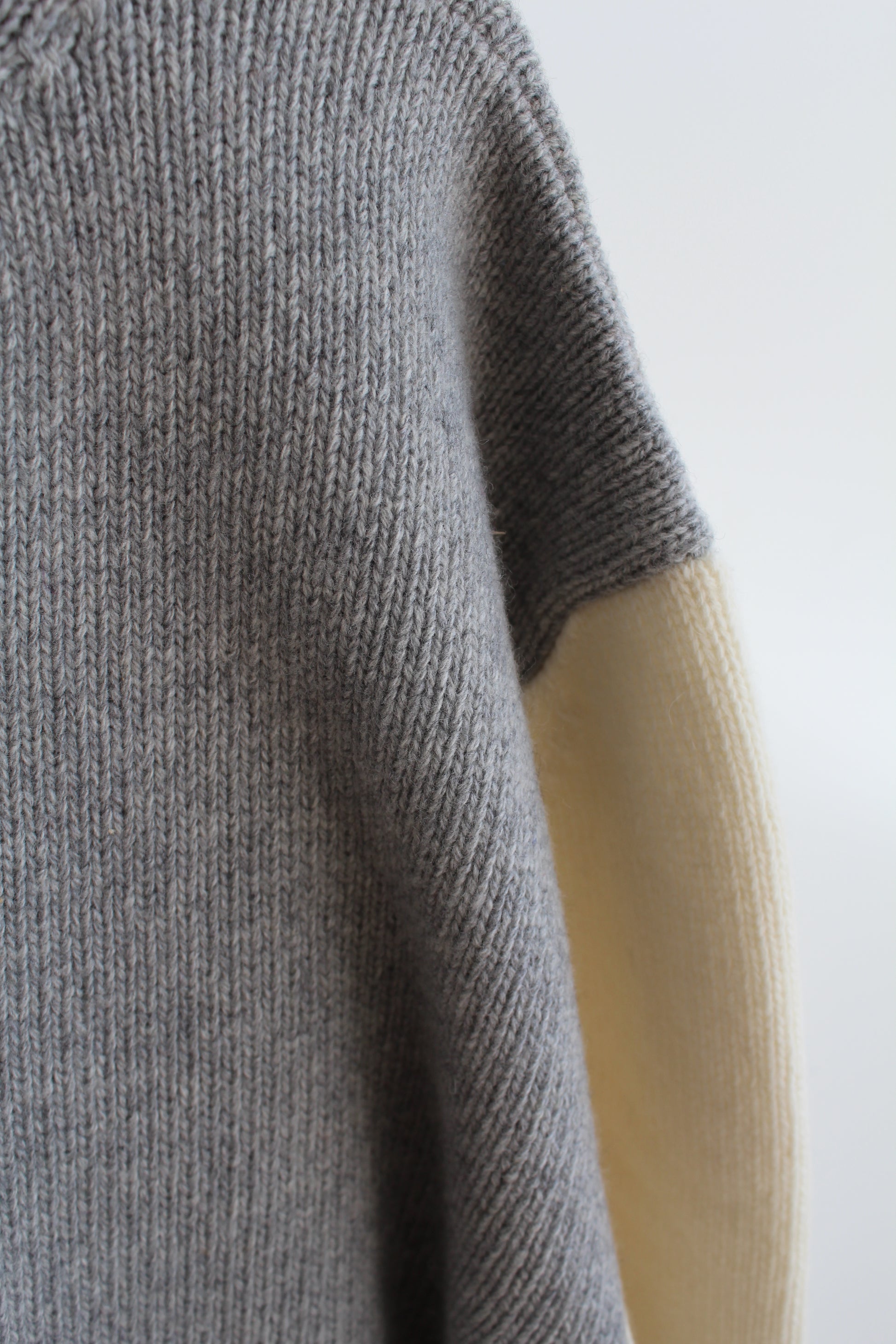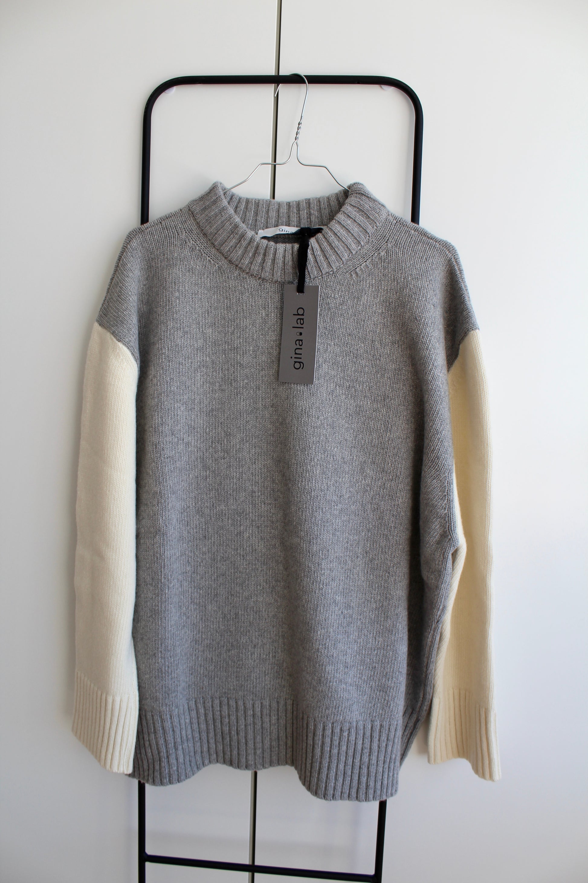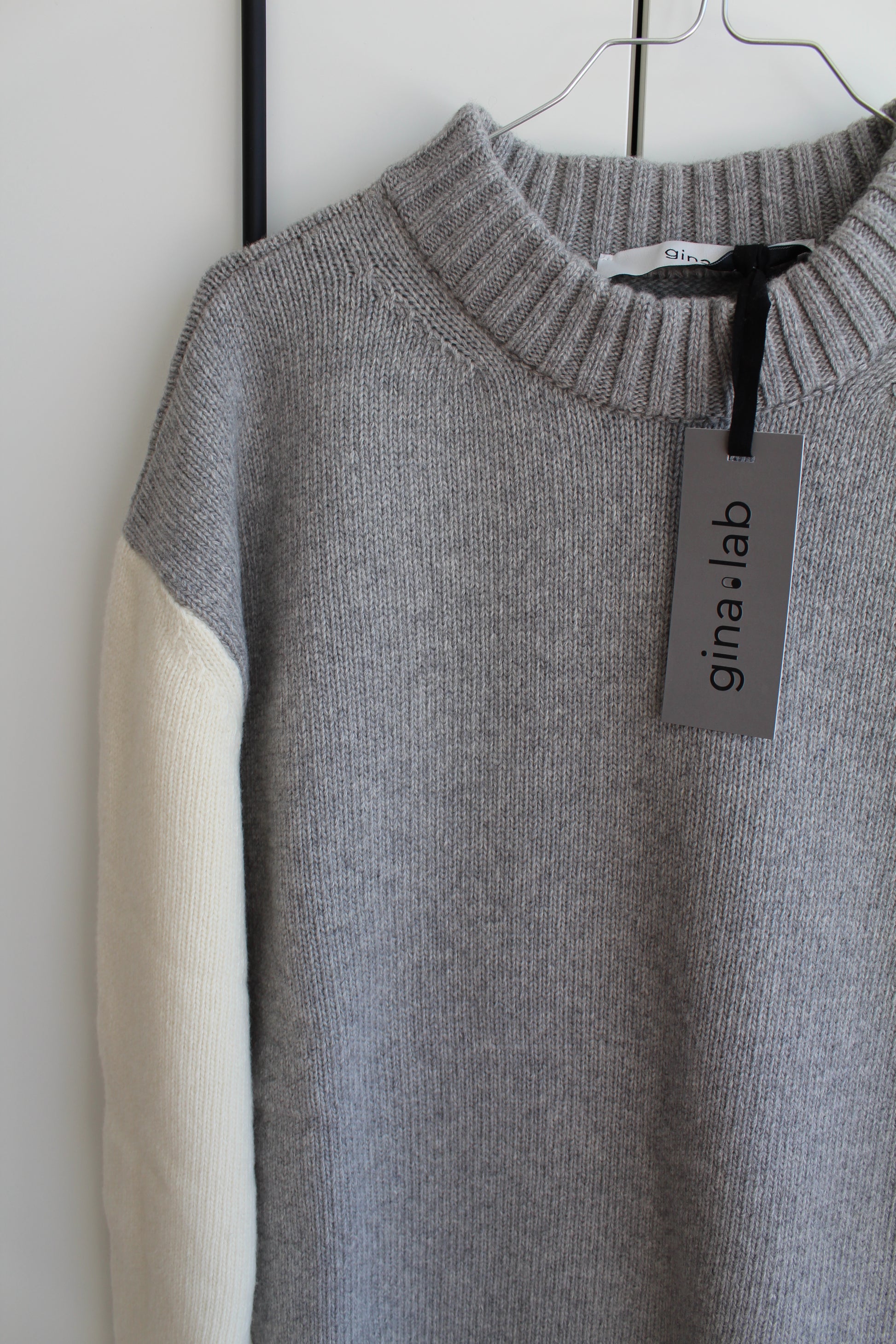 Skøn striktrøje fra Gina Tricot (Gina Lab kollektion) i størrelse M. Striktrøjen har et løst og oversize fit. Den er grå og hvid, og har turtleneck og ribbet søm. Den er fremstillet af genanvendt uld og er ny med tag ♡