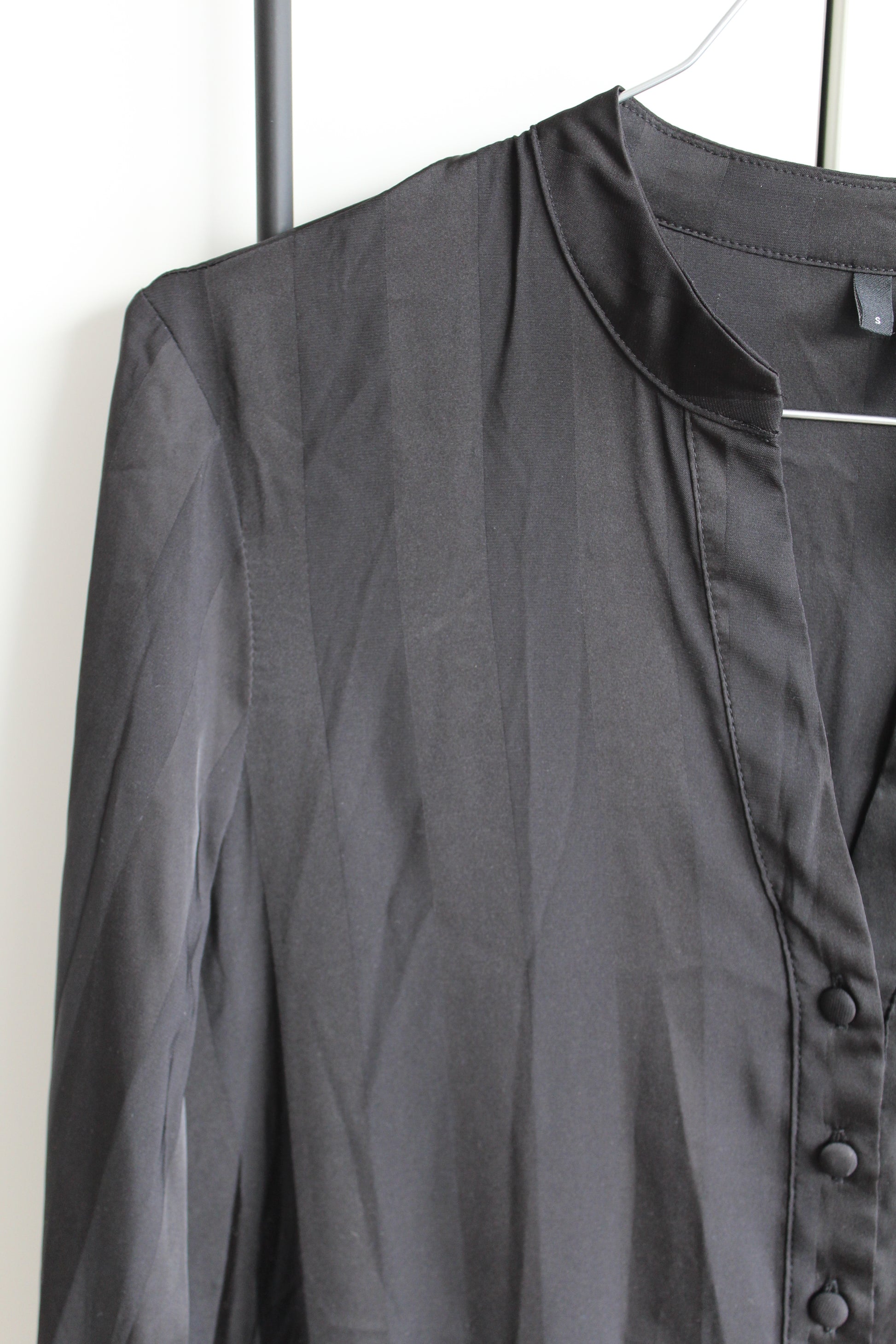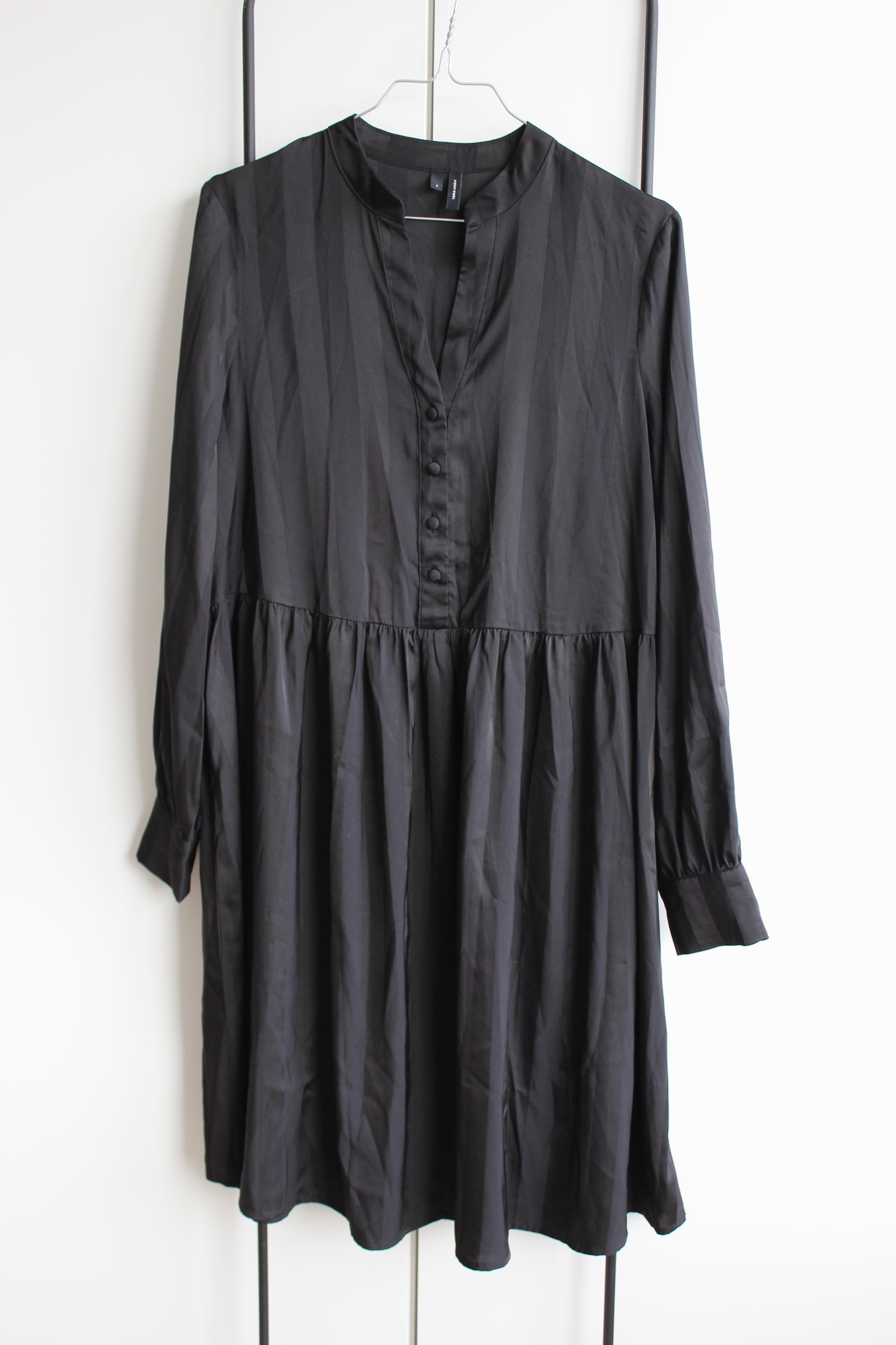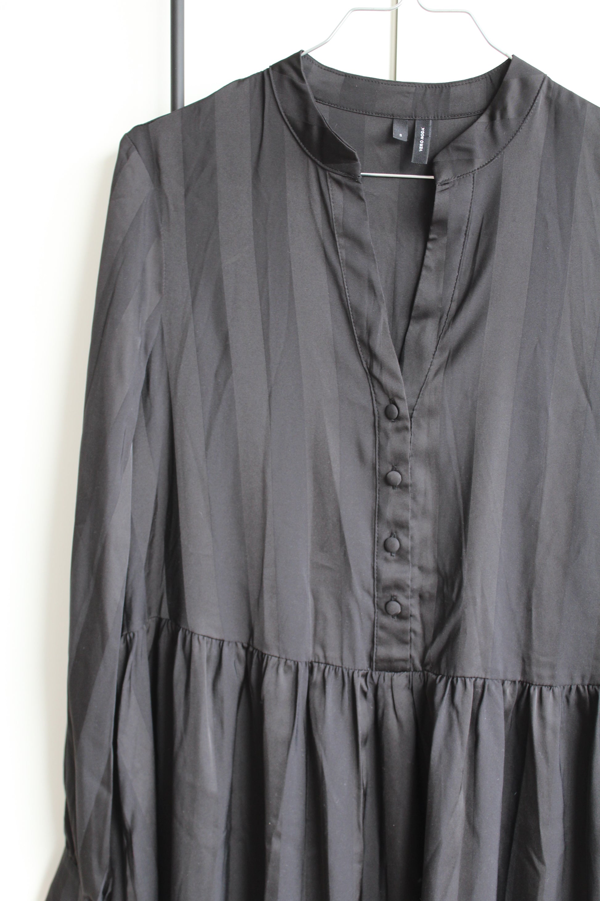 Flot sort kjole fra Vero Moda i størrelse S. Kjolen er sort og har et stribet mønster i stoffet. Den har v-udskæring og knapper foran samt i ærmeåbningerne ♡