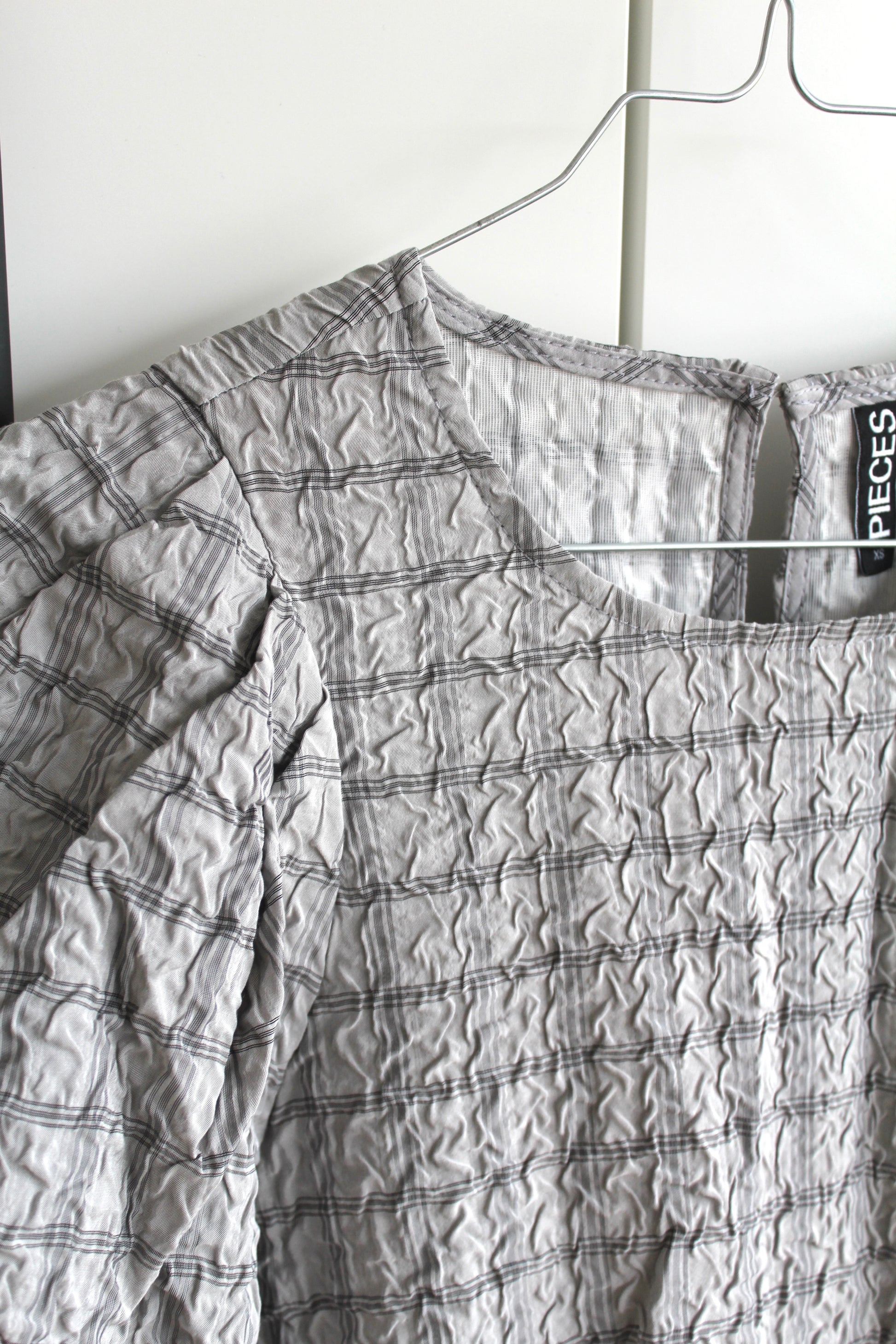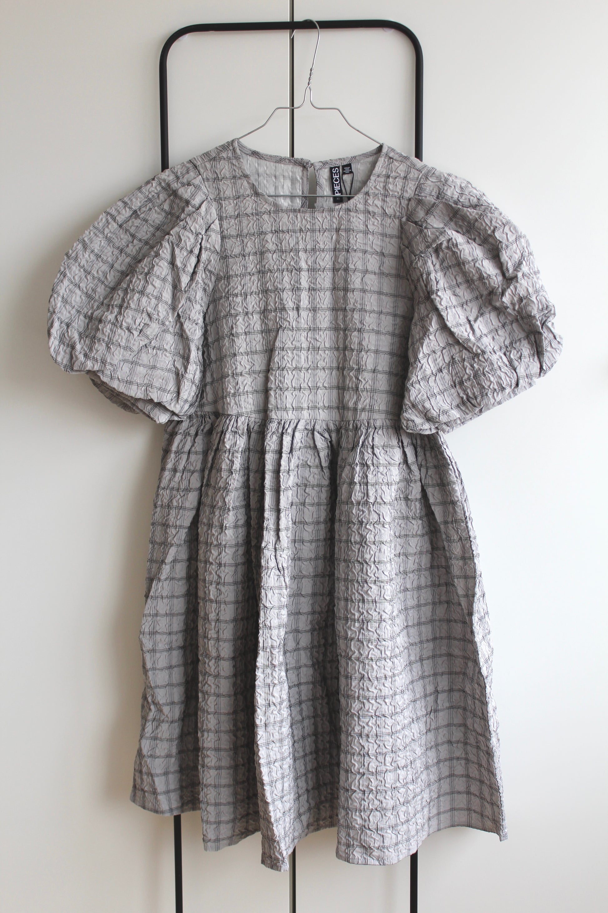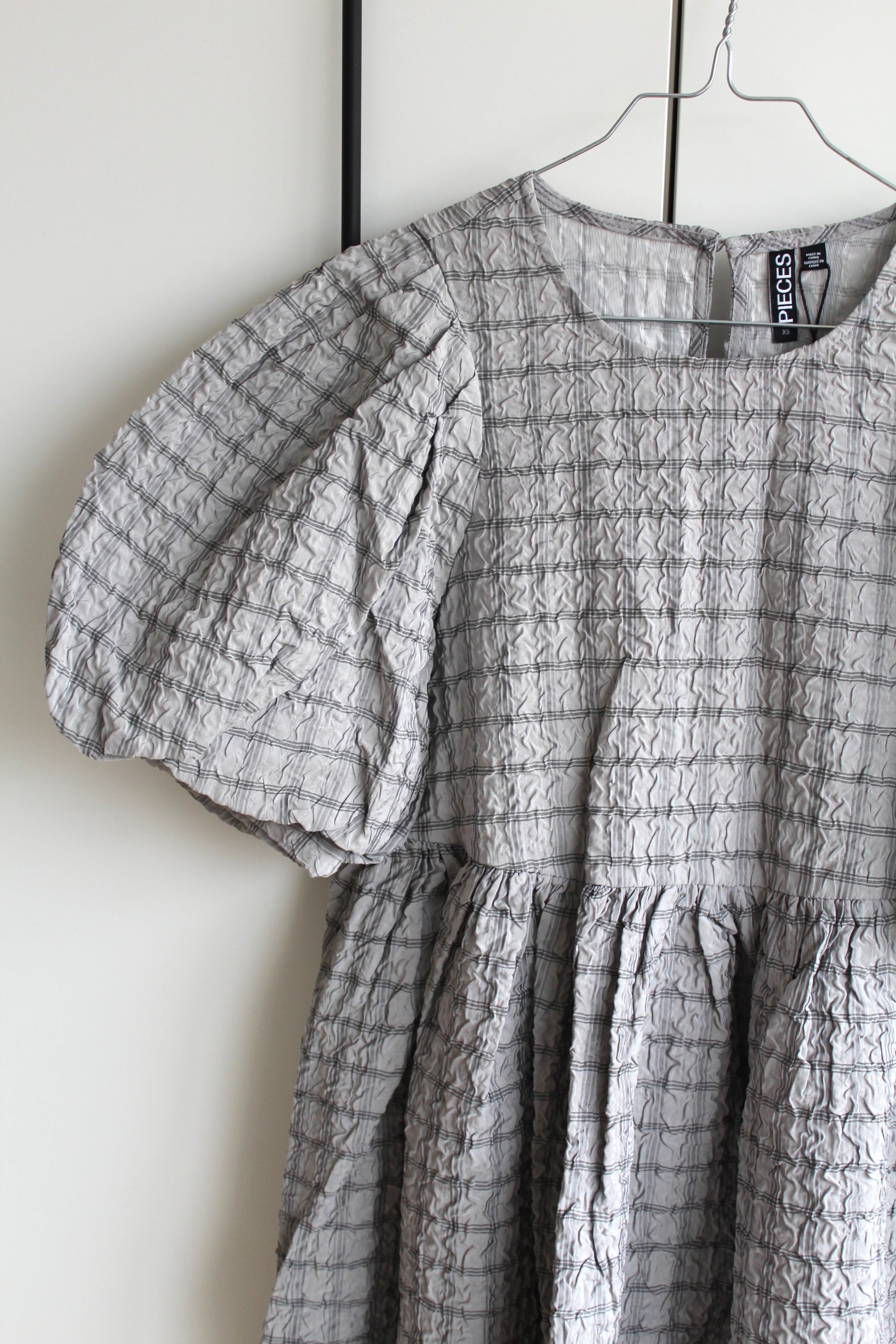 Fineste ballonkjole fra Pieces i størrelse XS - vurderes til også at passe en S. Kjolen er i et ternet mønster i grå nuancer. Den lukkes i nakken med en lille knap ♡