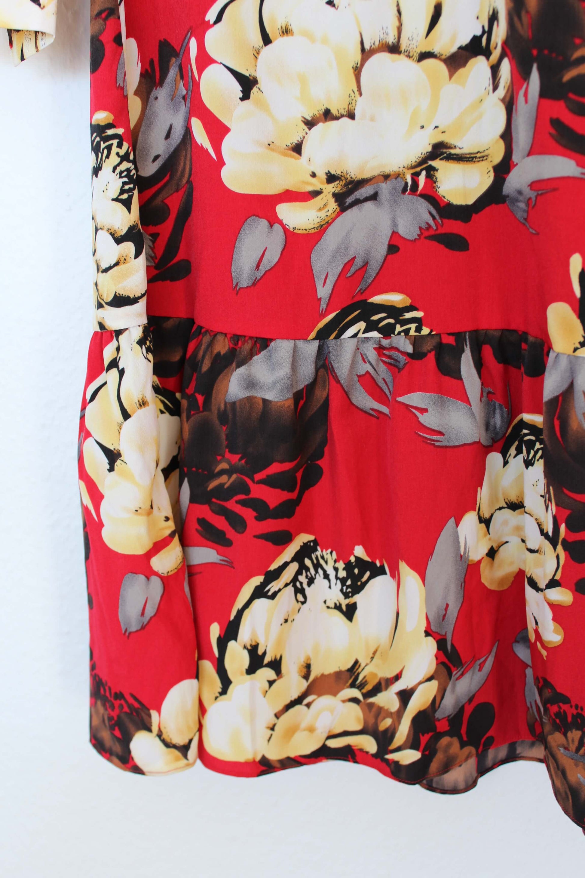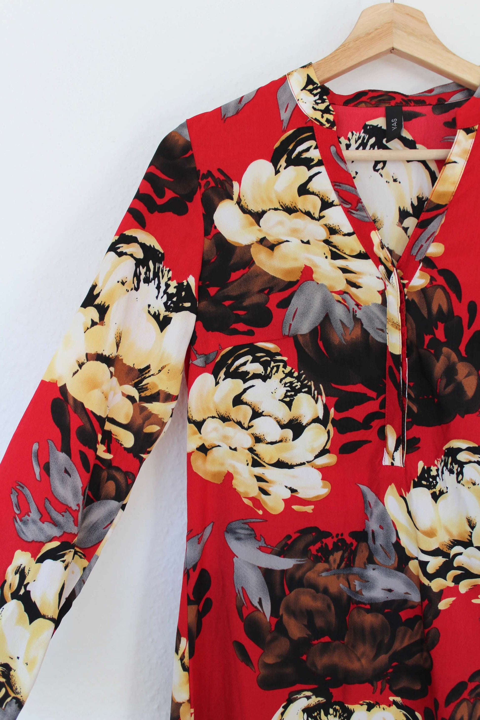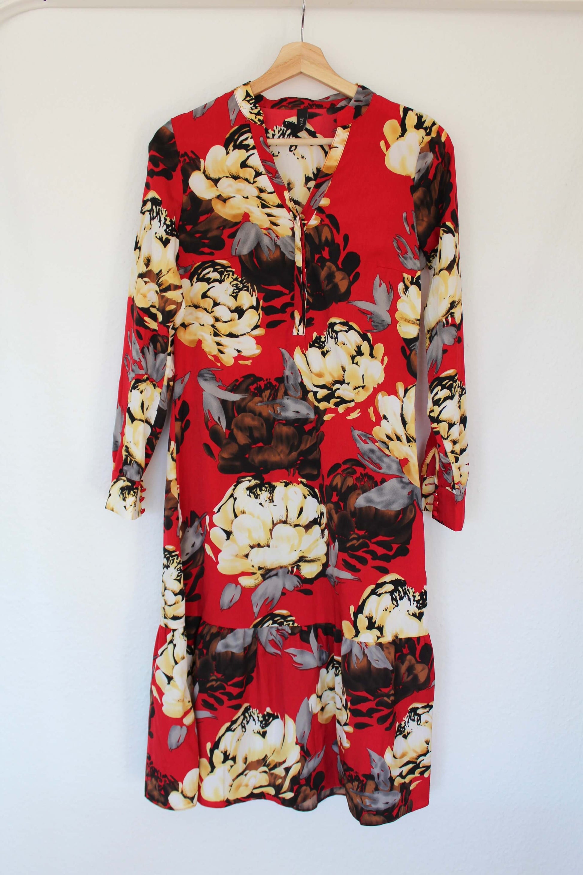 Smuk lang kjole fra Y.A.S i størrelse XS - vurderes til også at passe en S. Kjolen har V-udskæring samt 3 knapper foran. Kjolen har et blomstret mønster i røde nuancer ♡