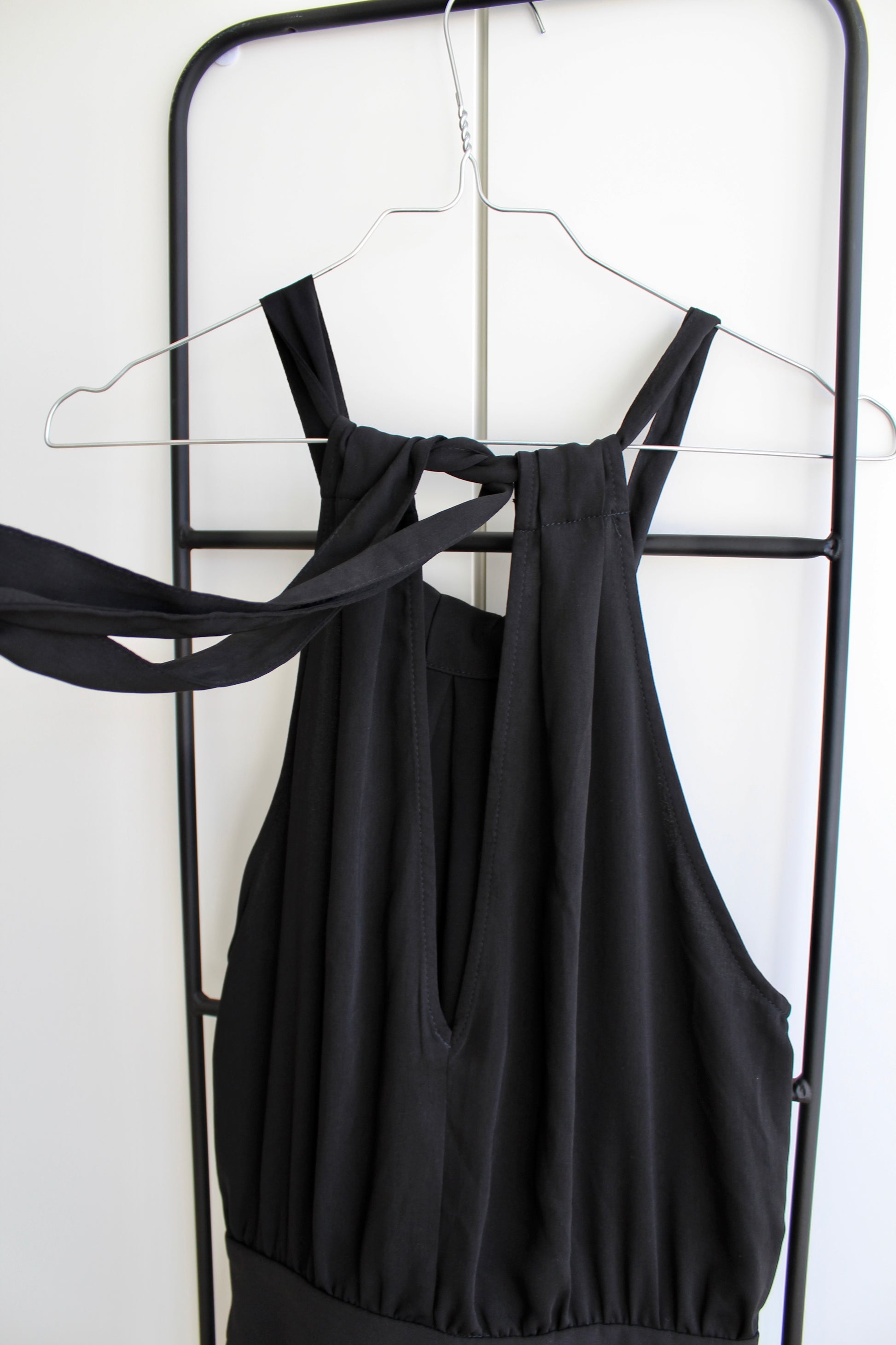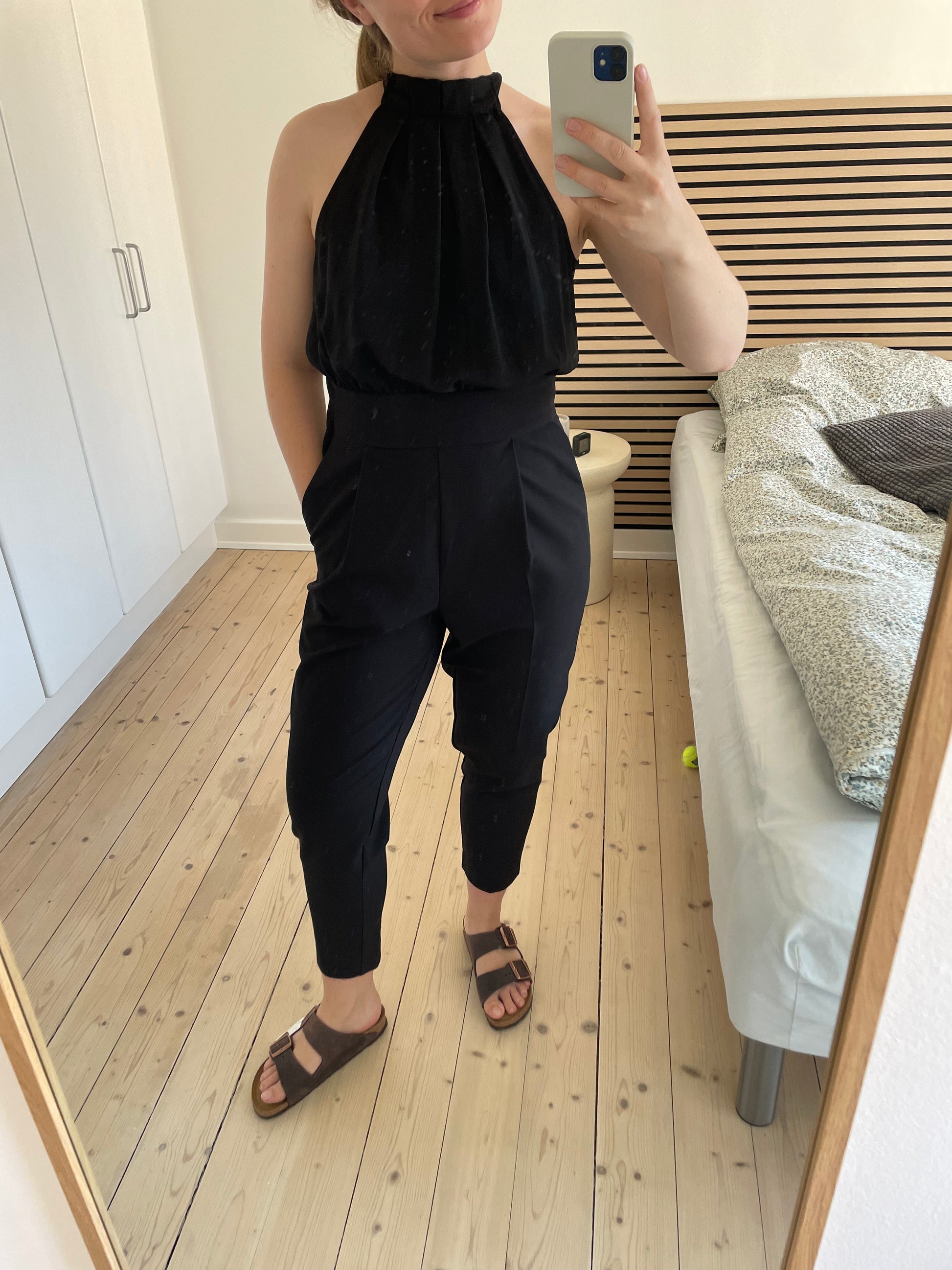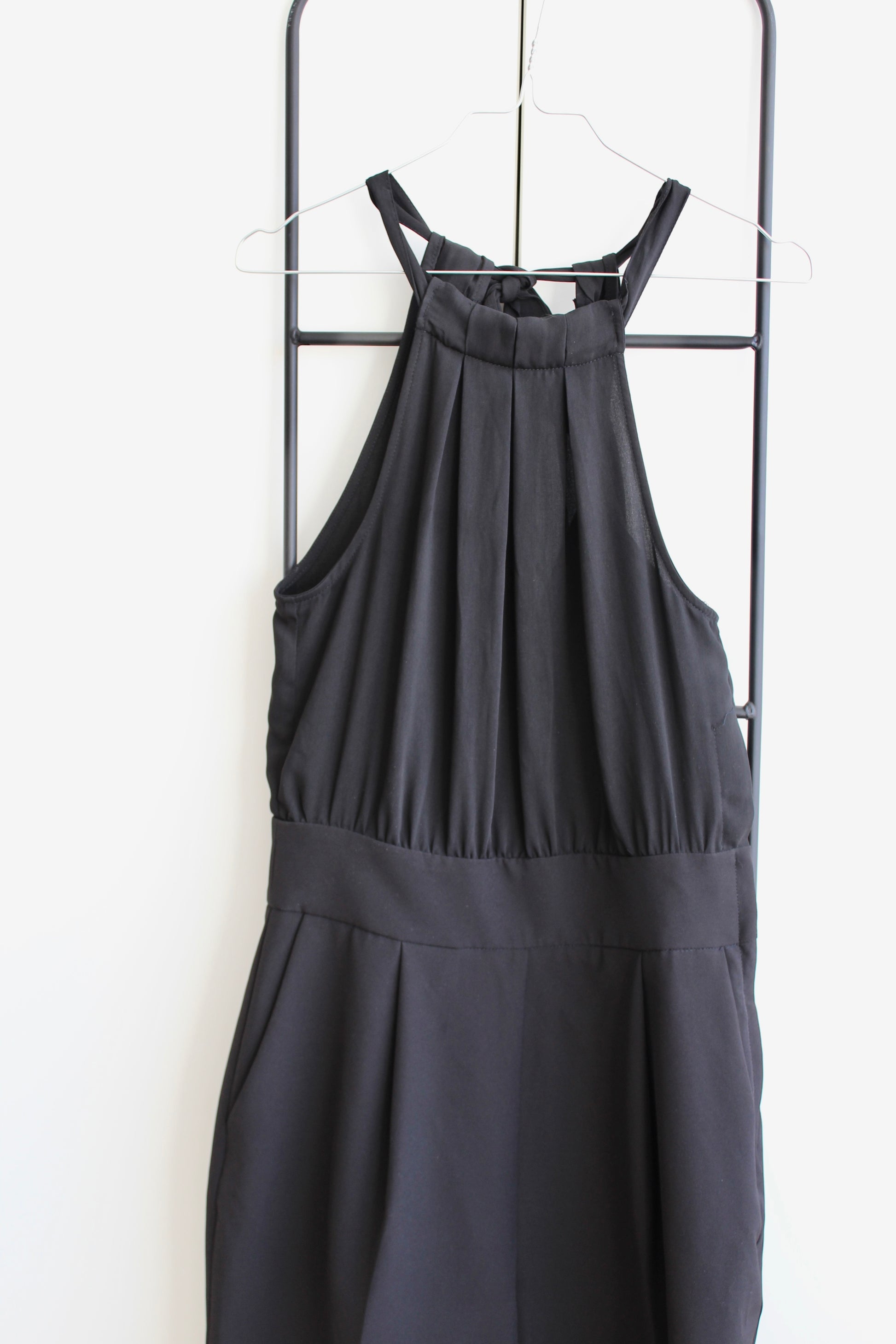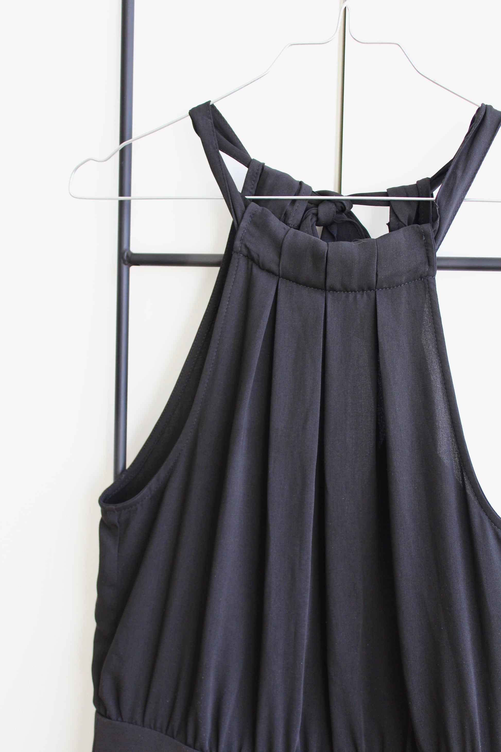 Fin og elegant buksedragt fra H&M i størrelse 38 - vurderes til at passe en 36 godt. Den er sort og lukkes i nakken med sløjfe. Den har lynlås i siden ♡
