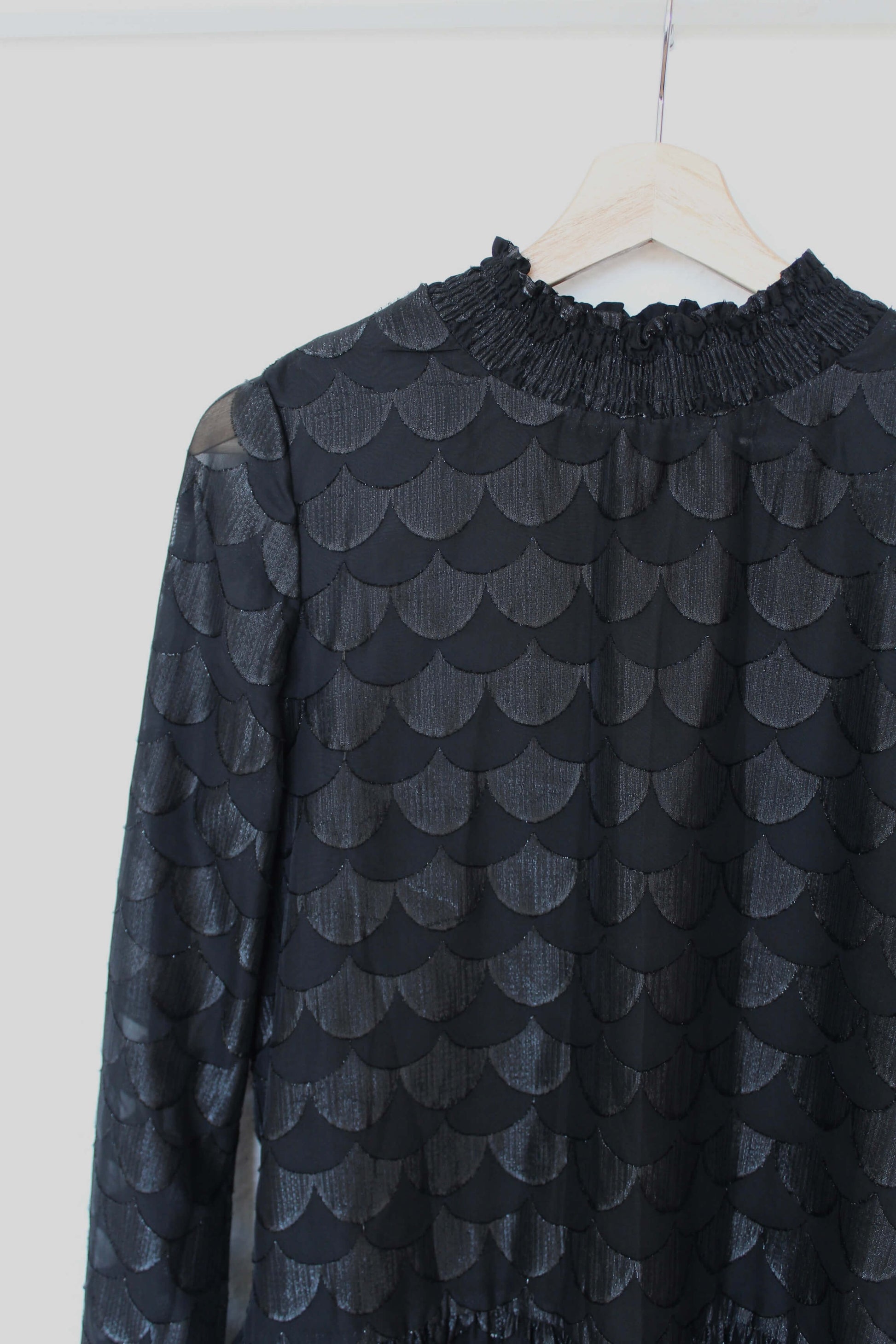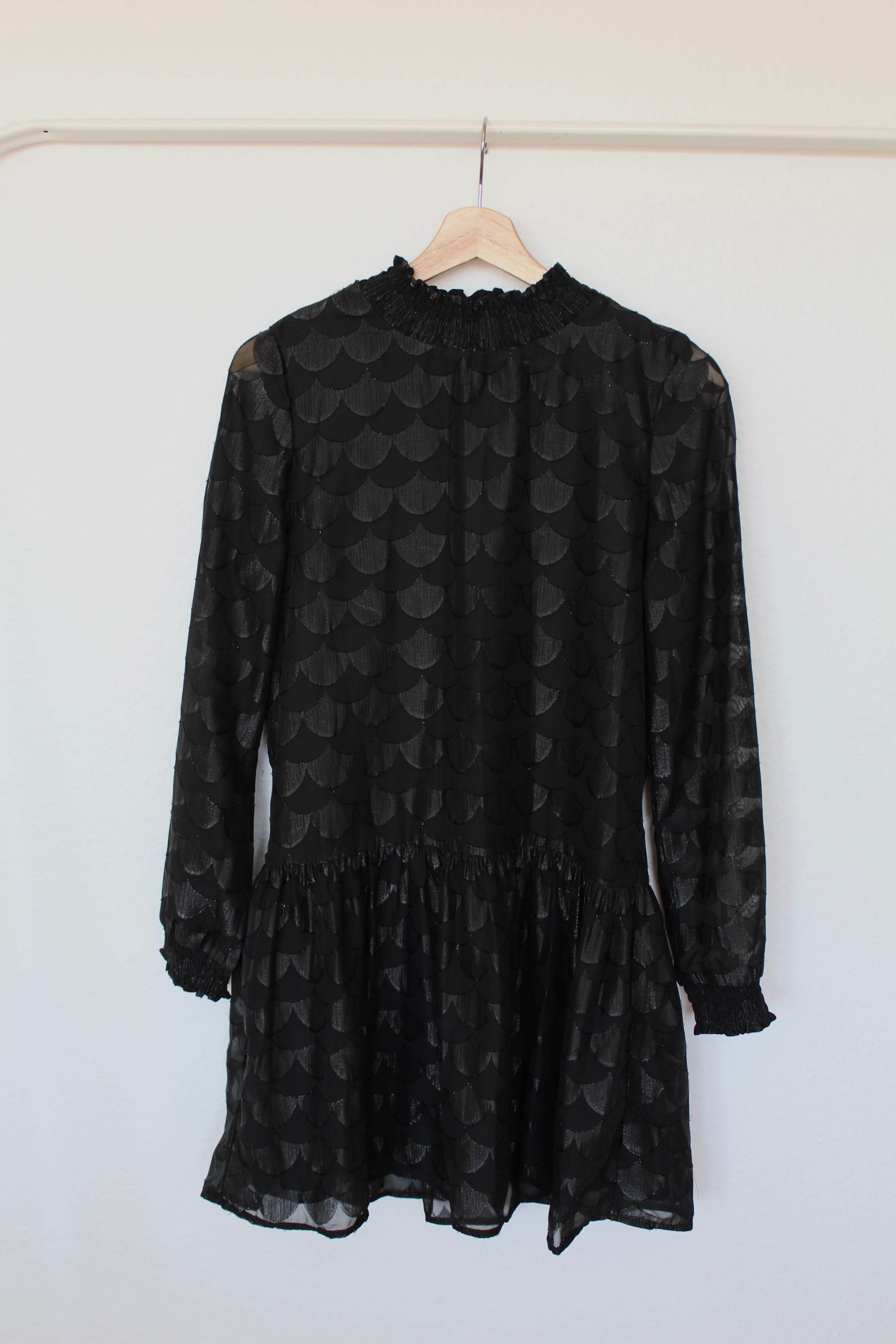 Fin sort kjole i størrelse 36 fra Only. Kjolen har høj hals og peplum-look. Der ses glimmer i mønstret over hele kjolen ♡