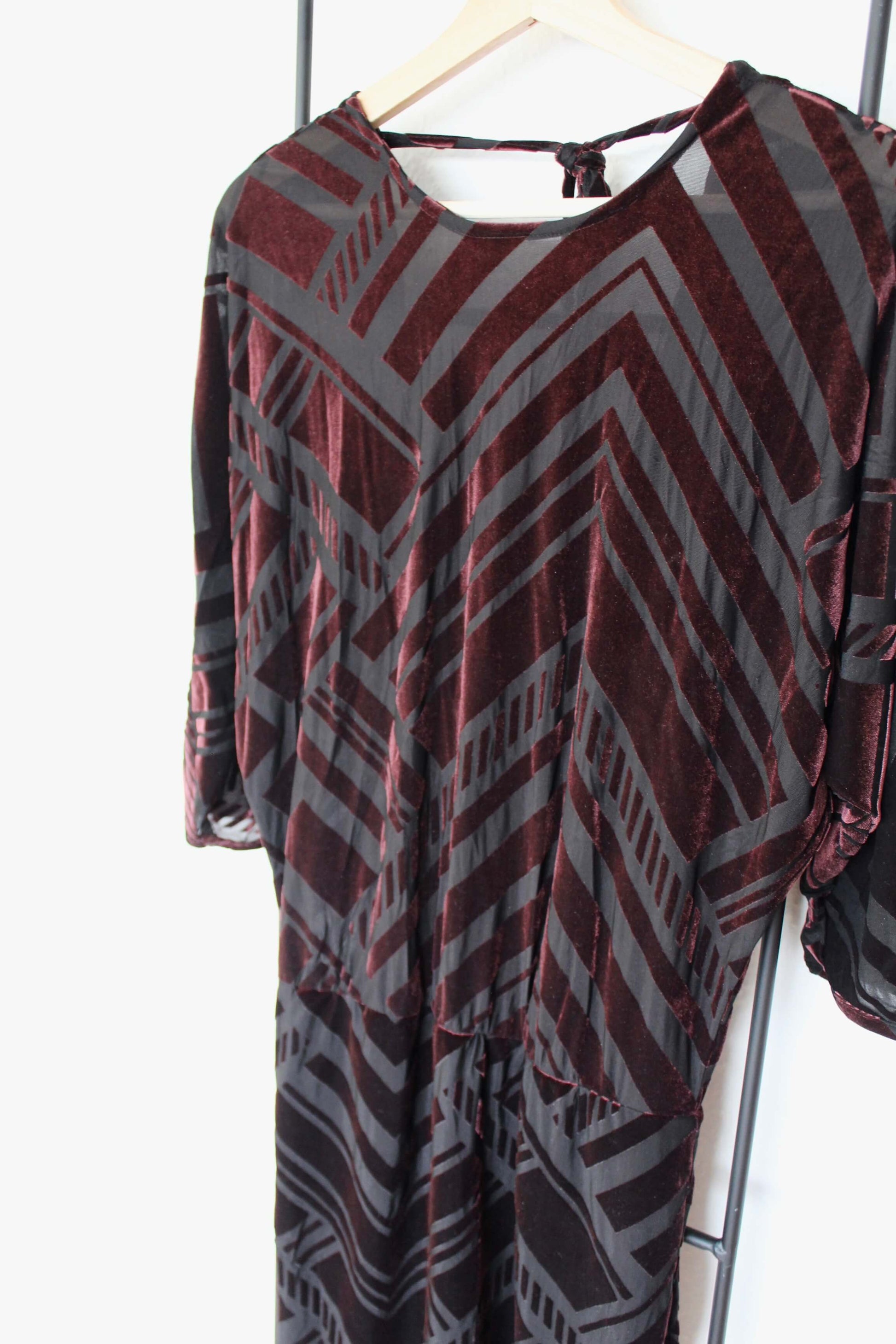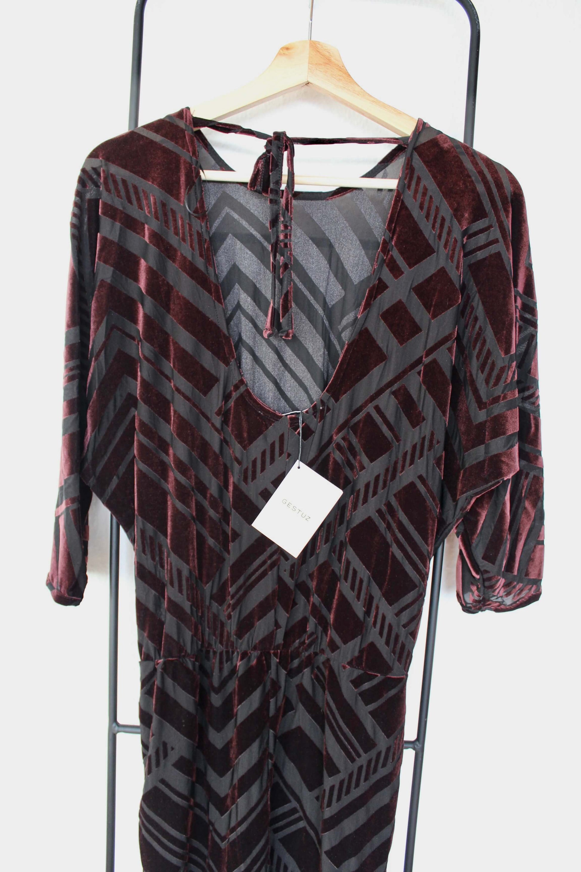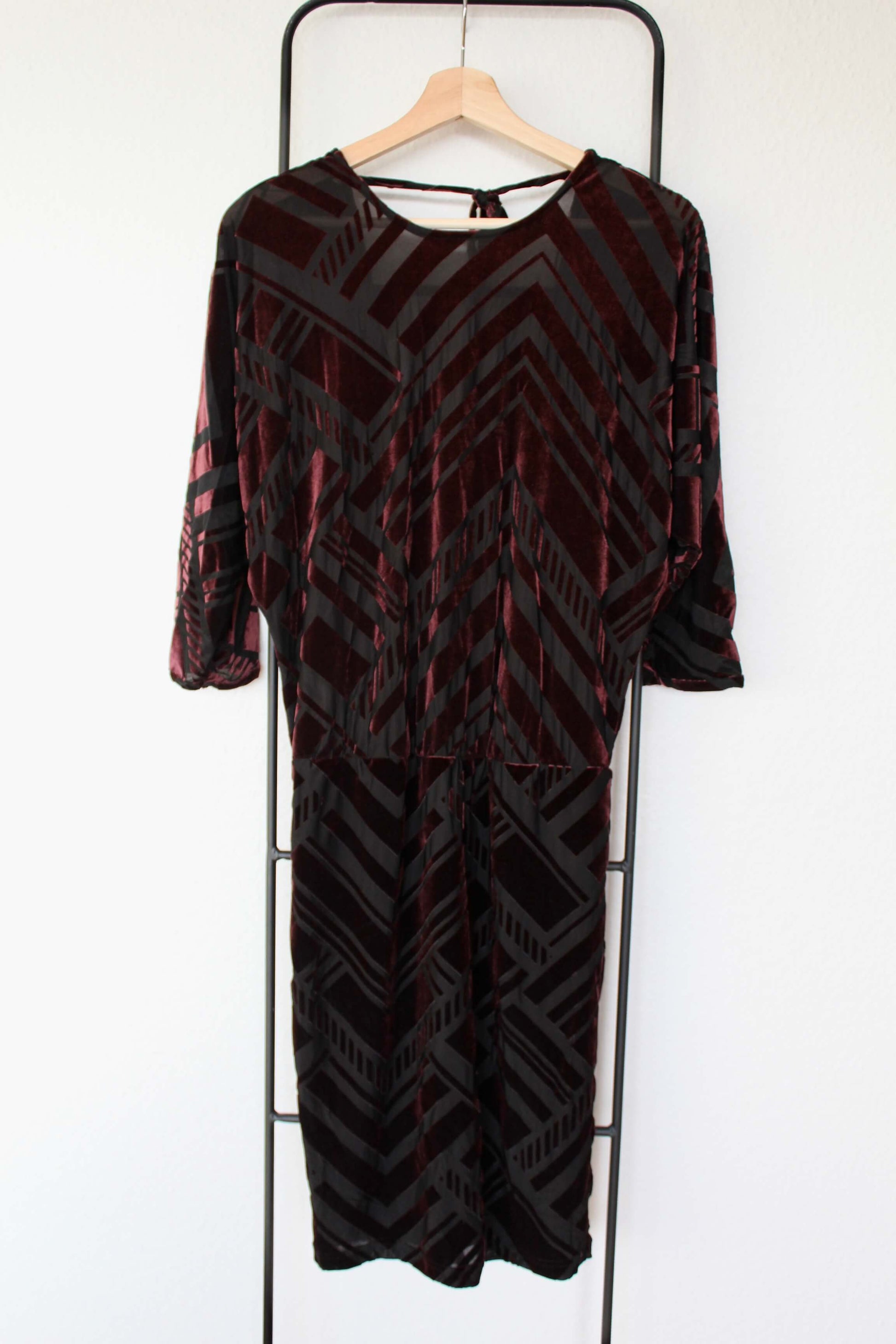 Fineste kjole fra Gestuz i størrelse XS - vurderes til også at passe en S. Kjolen har åben ryg med stropper der bindes i nakken. Kjolen har tætsiddende pasform forneden og løstsidende pasform for oven samt elastik i livet. Kjolens smukke mønster er i bordeauxfarvet velour. Den er ny med tag ♡