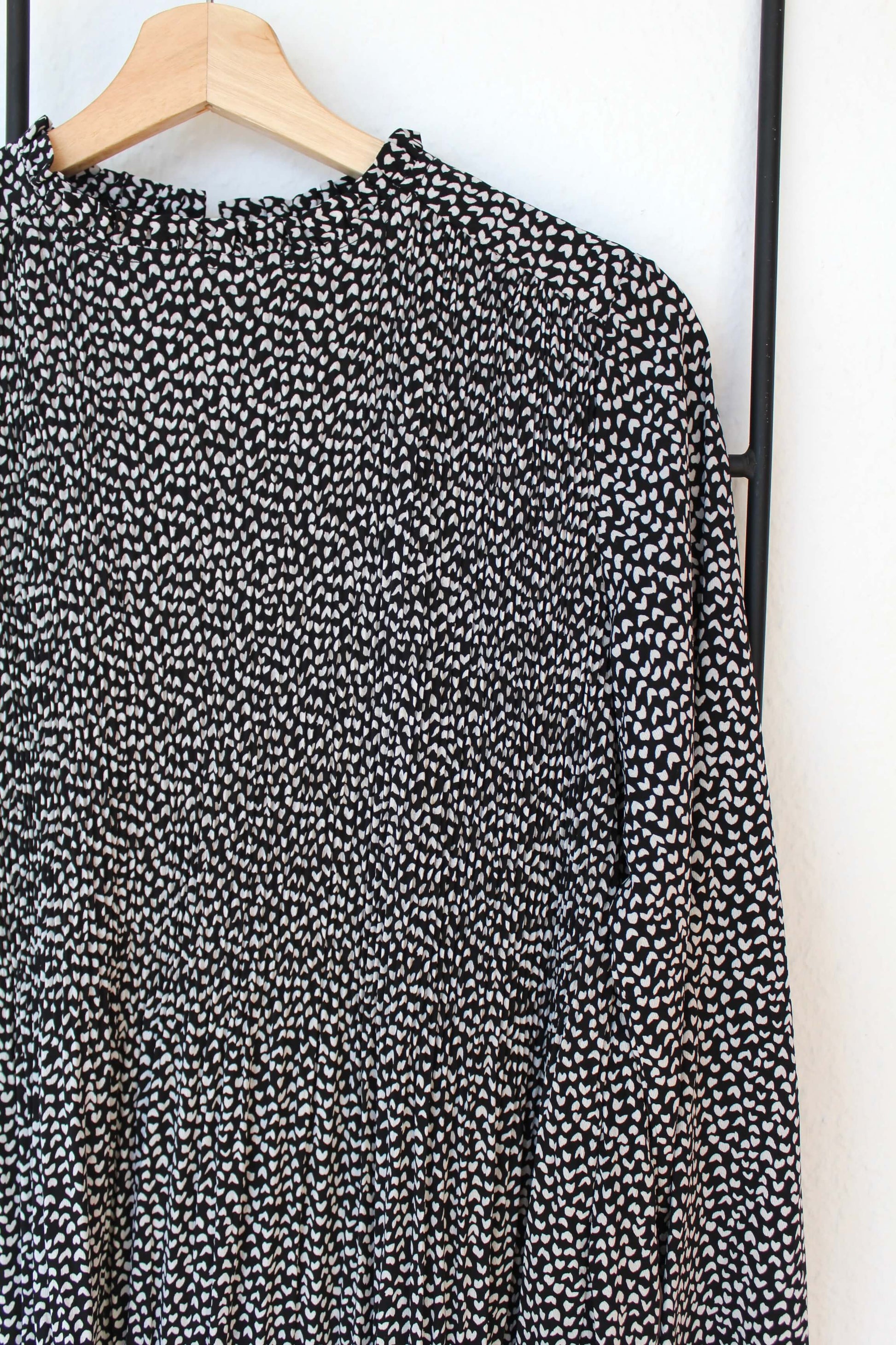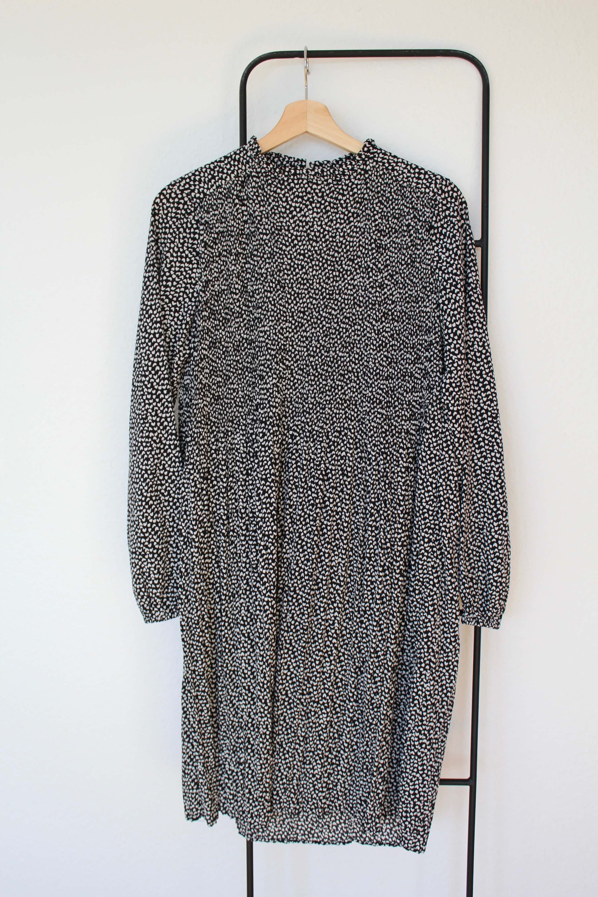 Fineste kjole fra Sisters Point i størrelse S. Kjolen er sort med hvide prikker. Den har rund hals med flæsekrave samt plissering i toppen. Den har stræk i ærmeåbningen og den lukkes i nakken med en lille knap ♡