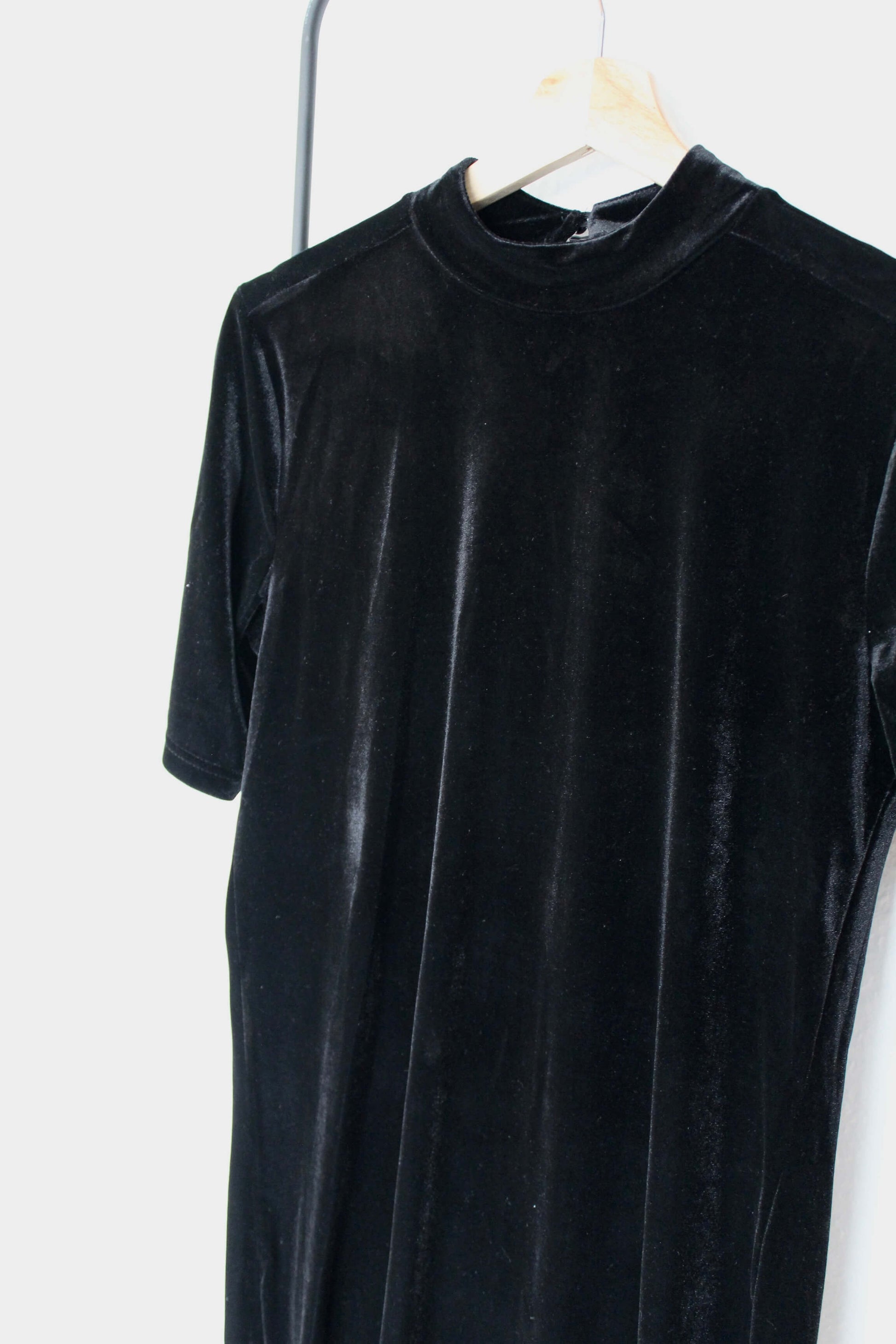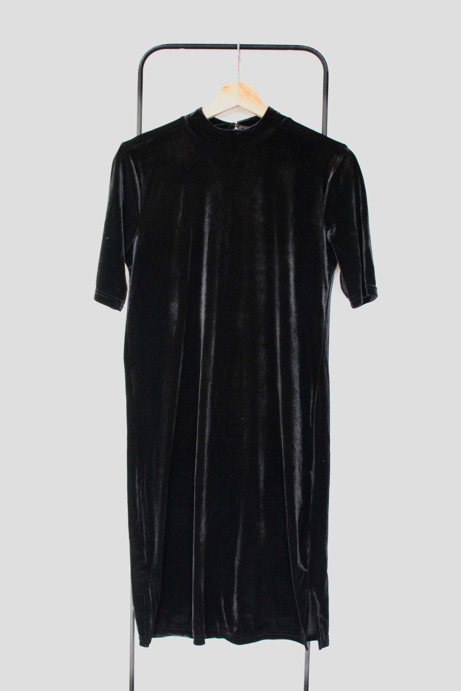 Smuk og enkel velourkjole fra Peppercorn i størrelse S. Kjolen har høj hals og korte ærmer. Den spændes i nakken med to små knapper, og den har en lille slids i begge sider ♡