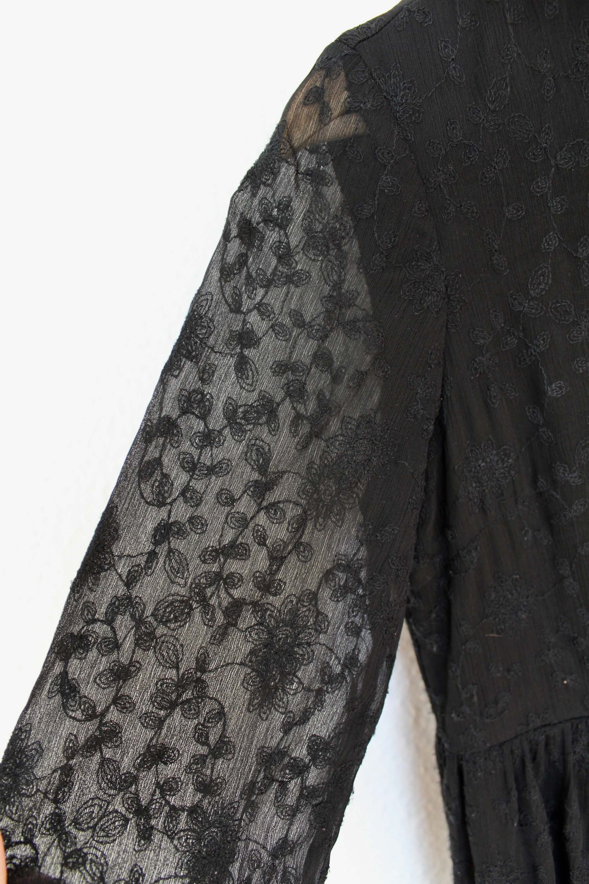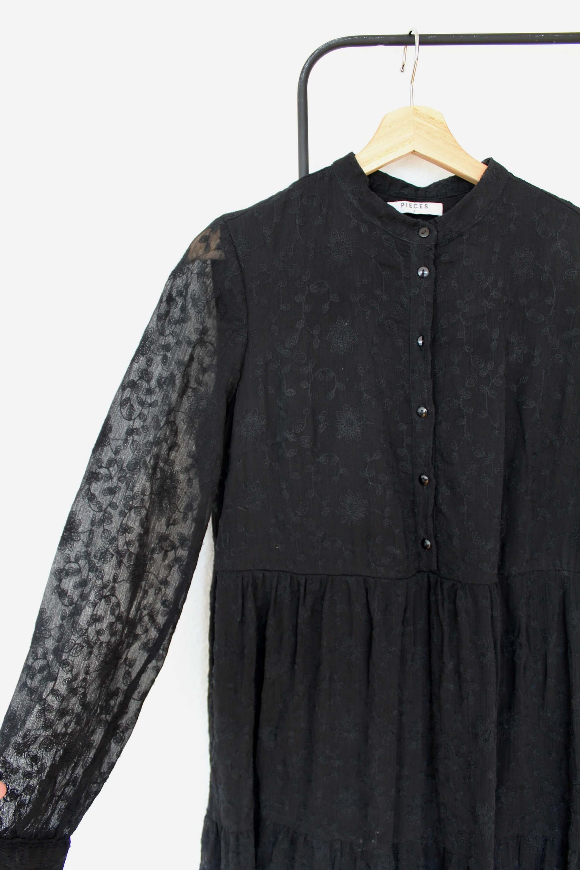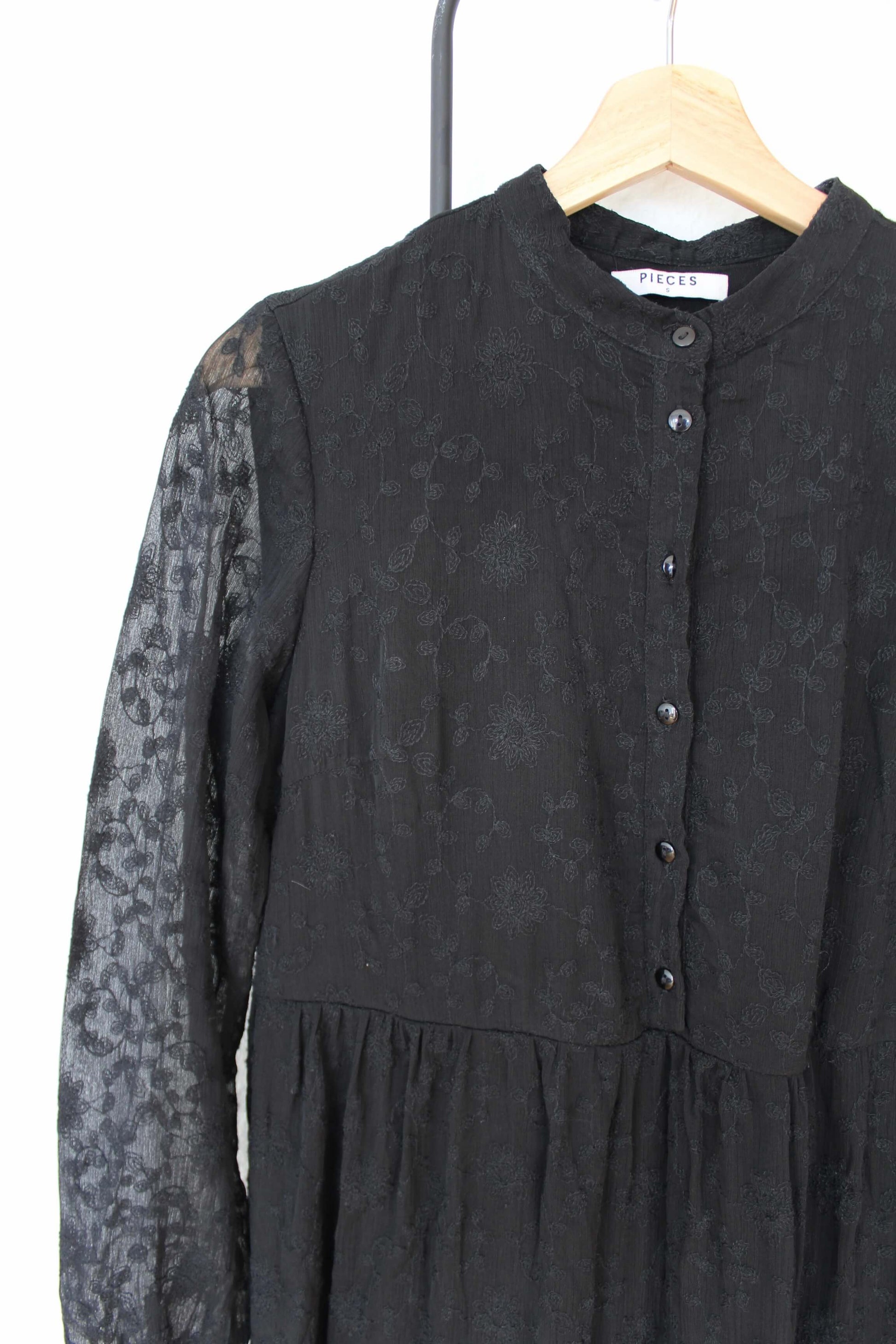 Fineste lange kjole fra Pieces i størrelse S - vurderes til også at passe en lille M. Kjolen er sort med gennemsigtige ærmer. Der er et blomstret mønster på hele kjolen, og da den er lidt "tung", falder den rigtig smukt ned af kroppen ♡