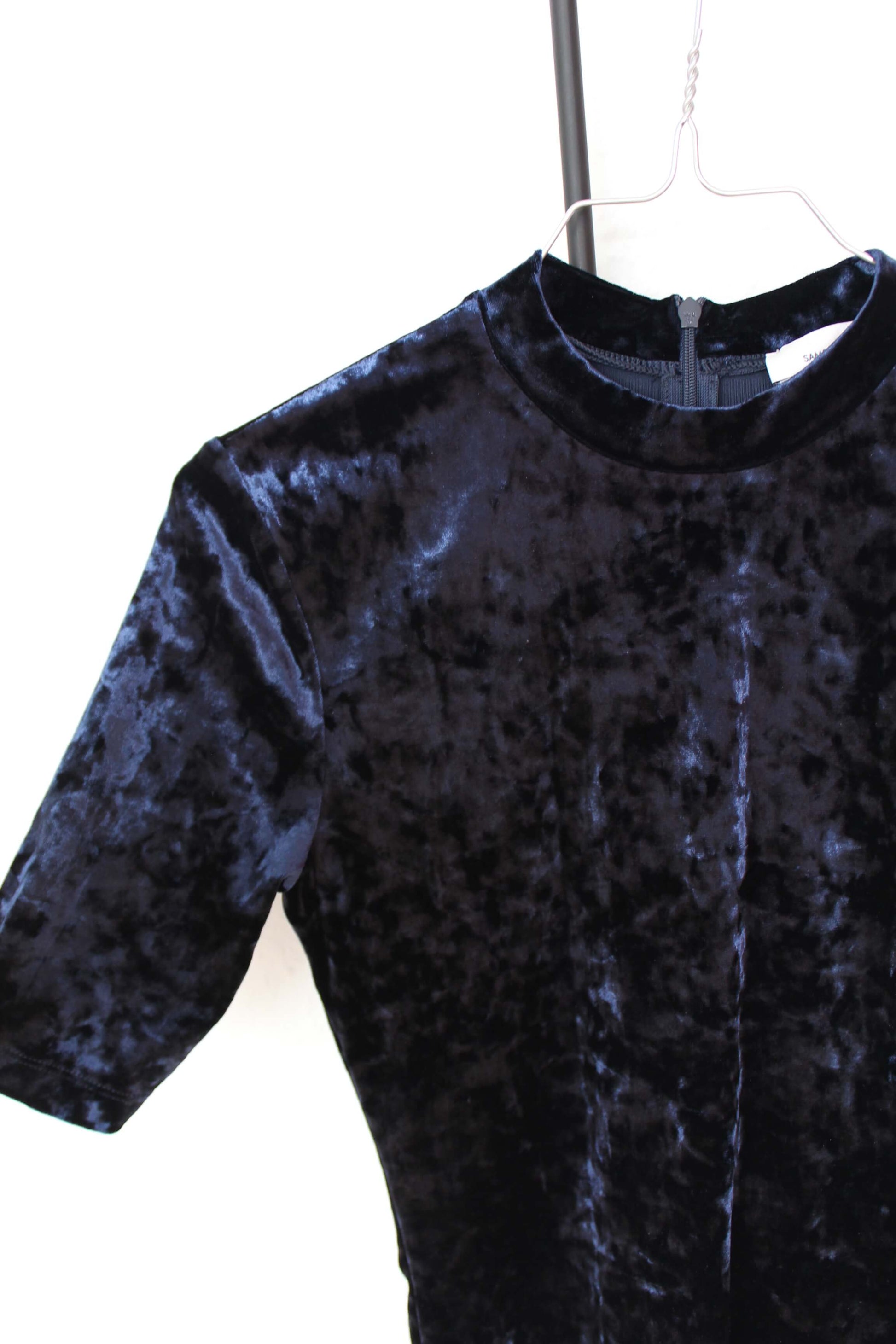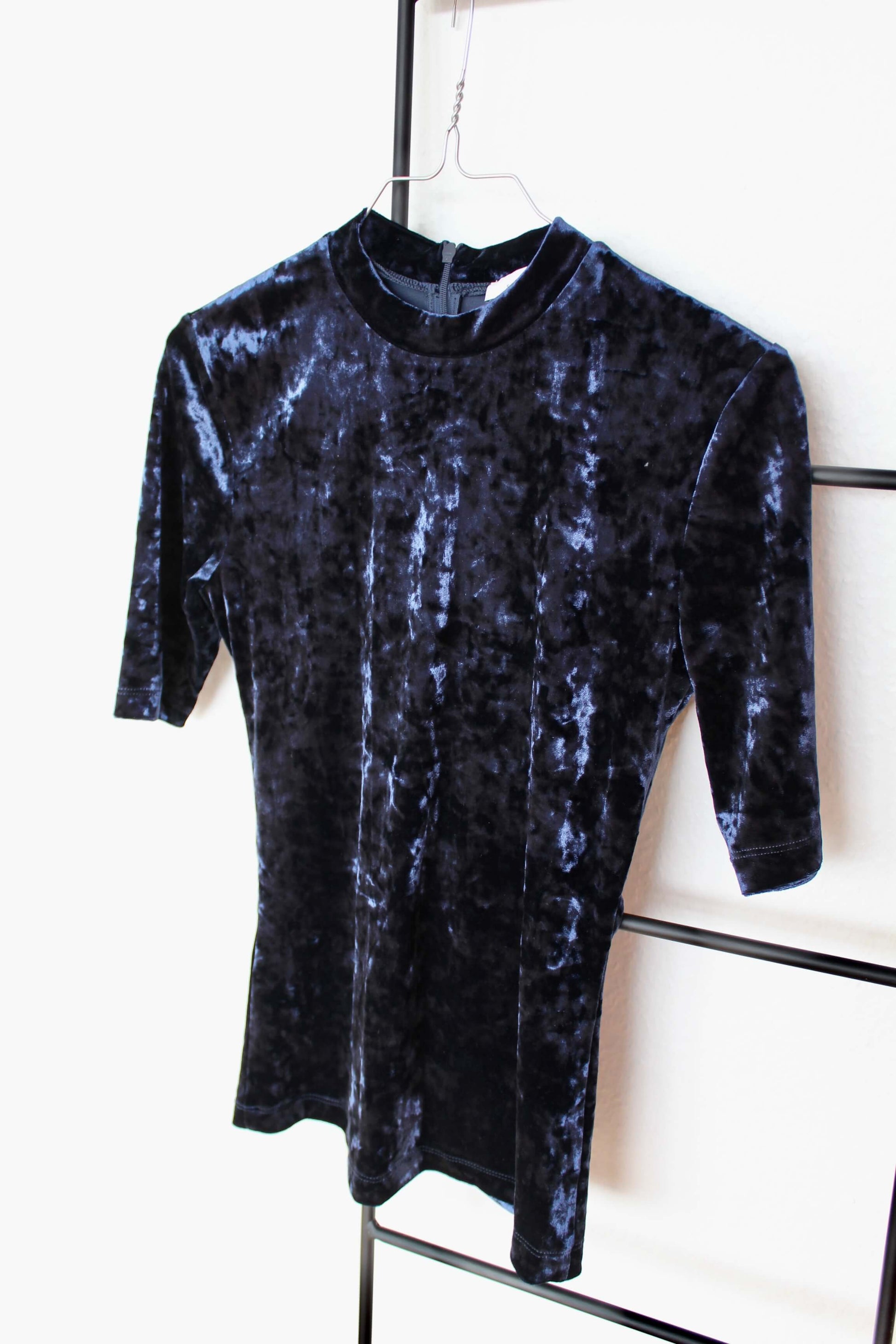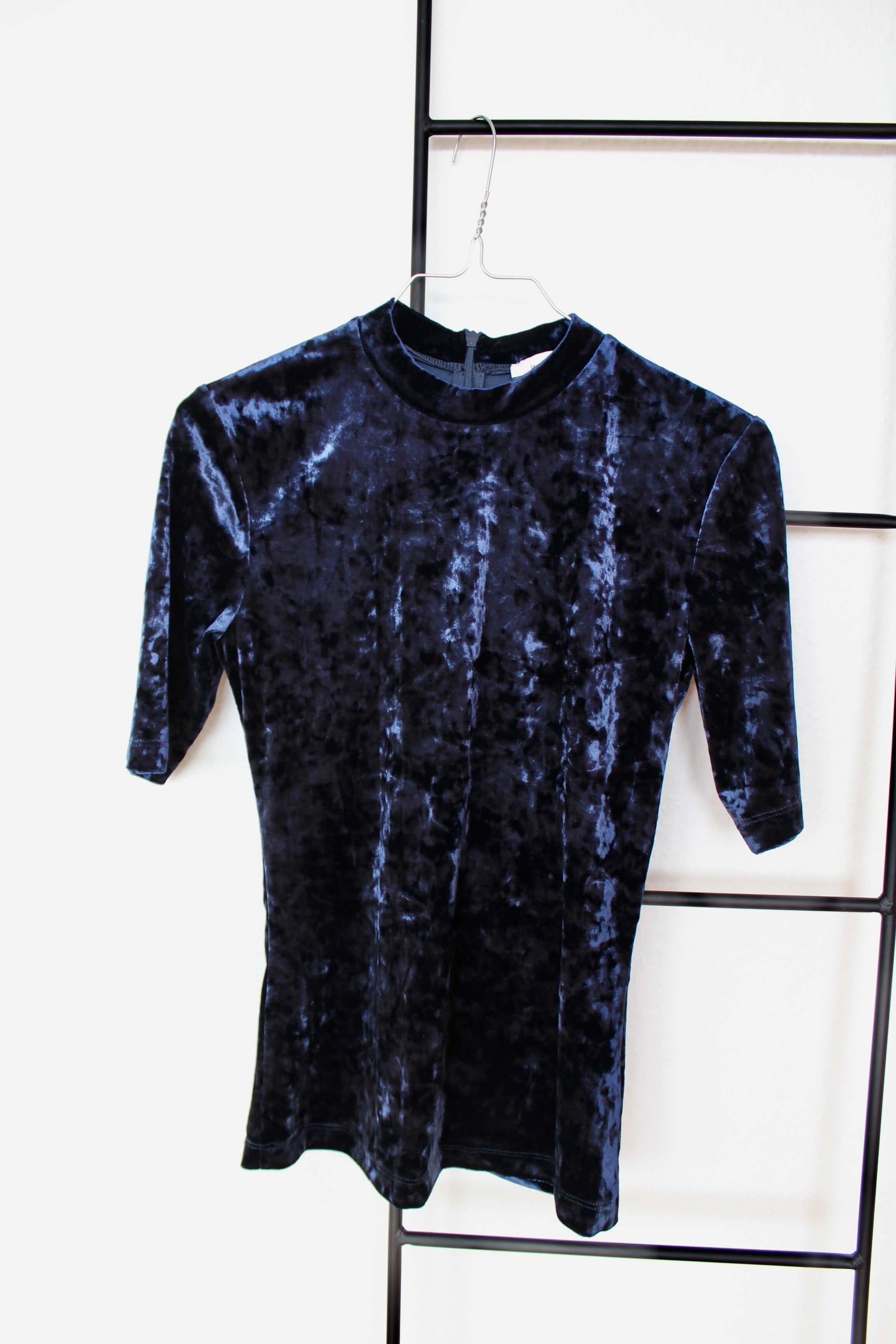 Smuk velourbluse fra Samsøe Samsøe i størrelse XS. Blusen er safir-blå og den har høj hals. Den lukkes med lynlås i nakken ♡